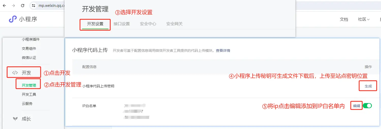 4.小程序代码上传 可在微信小程序平台中,在侧边栏选择开发,选择开发管理,在开发设置中可以生成.key文件,下载后将文件上传至此即可