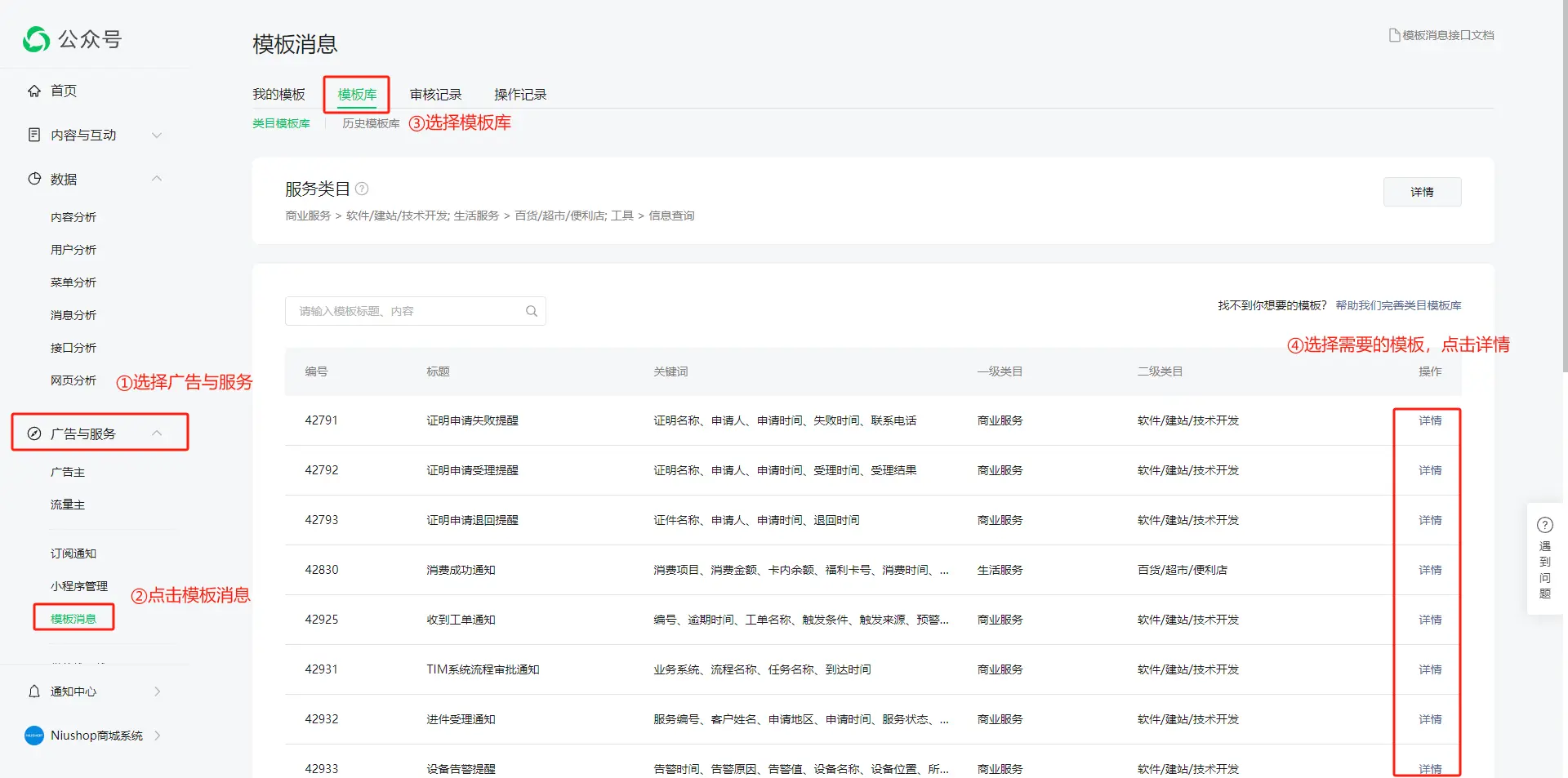 3.在侧边栏选择广告与服务,点击模板信息,点击模板库,选择需要的模板,点击详情