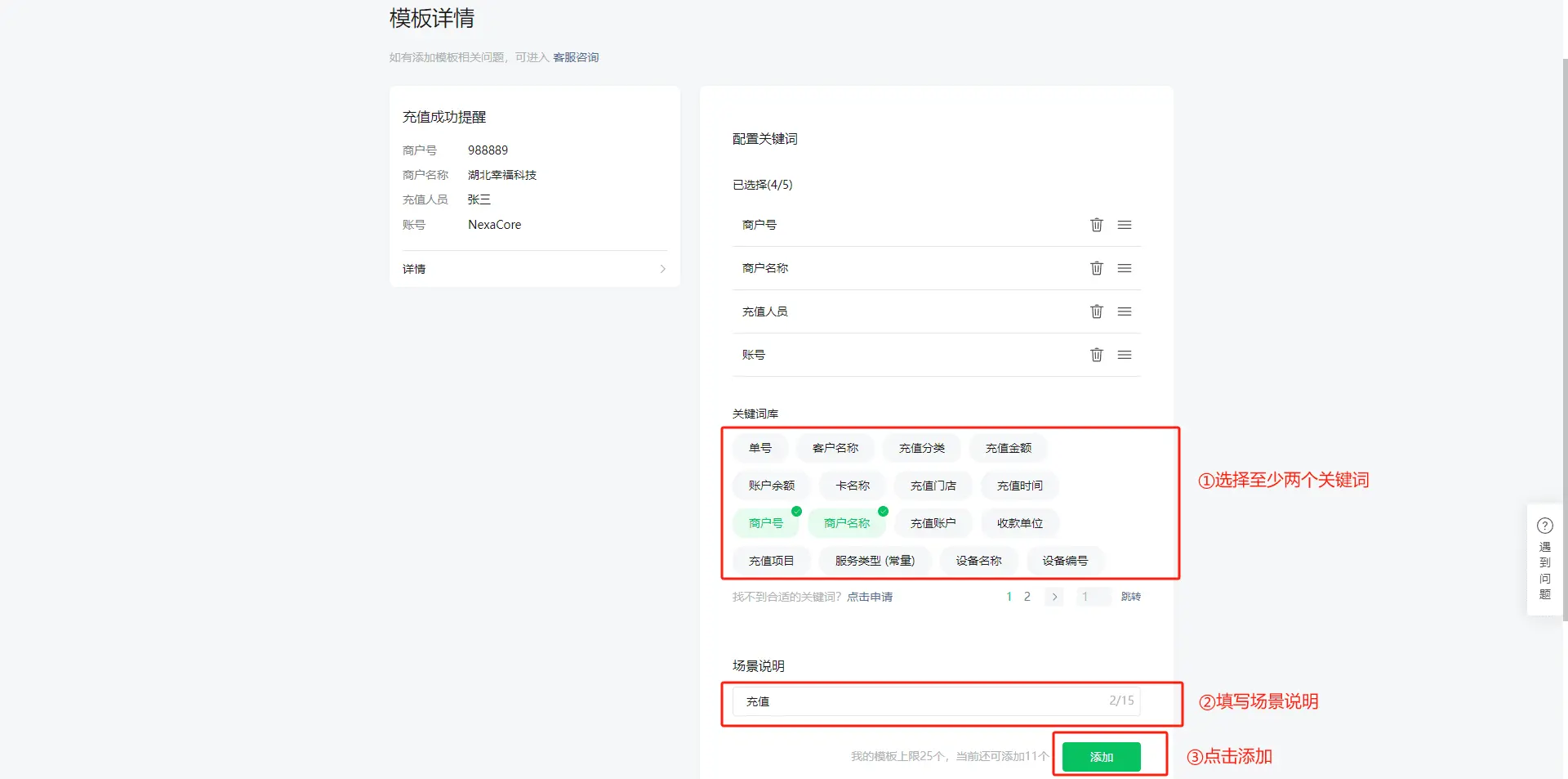 4.进去后选择至少两个关键词库,填写场景说明,点击添加