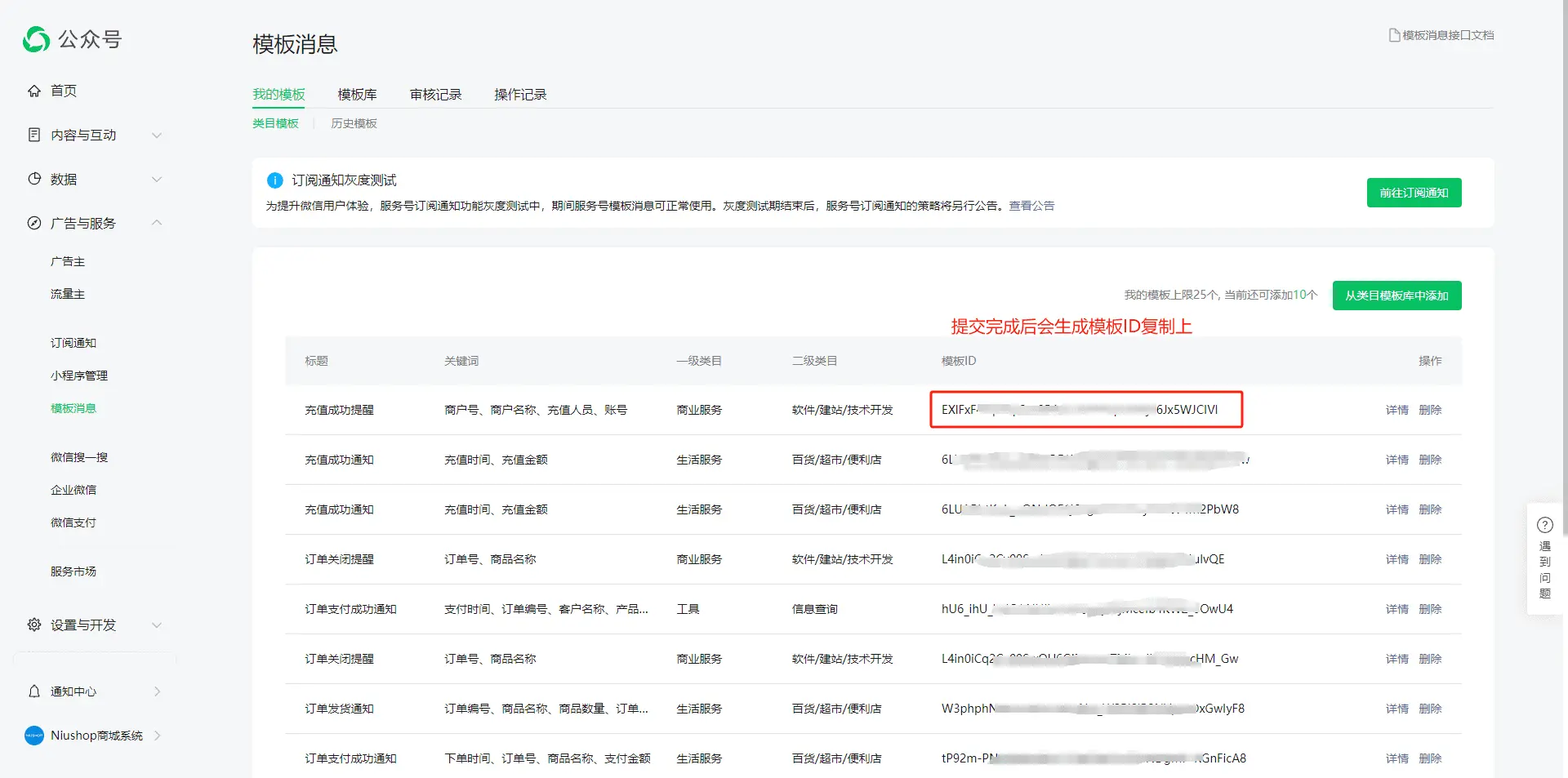 6.点击提交后,我的模板就会自动生成模板ID