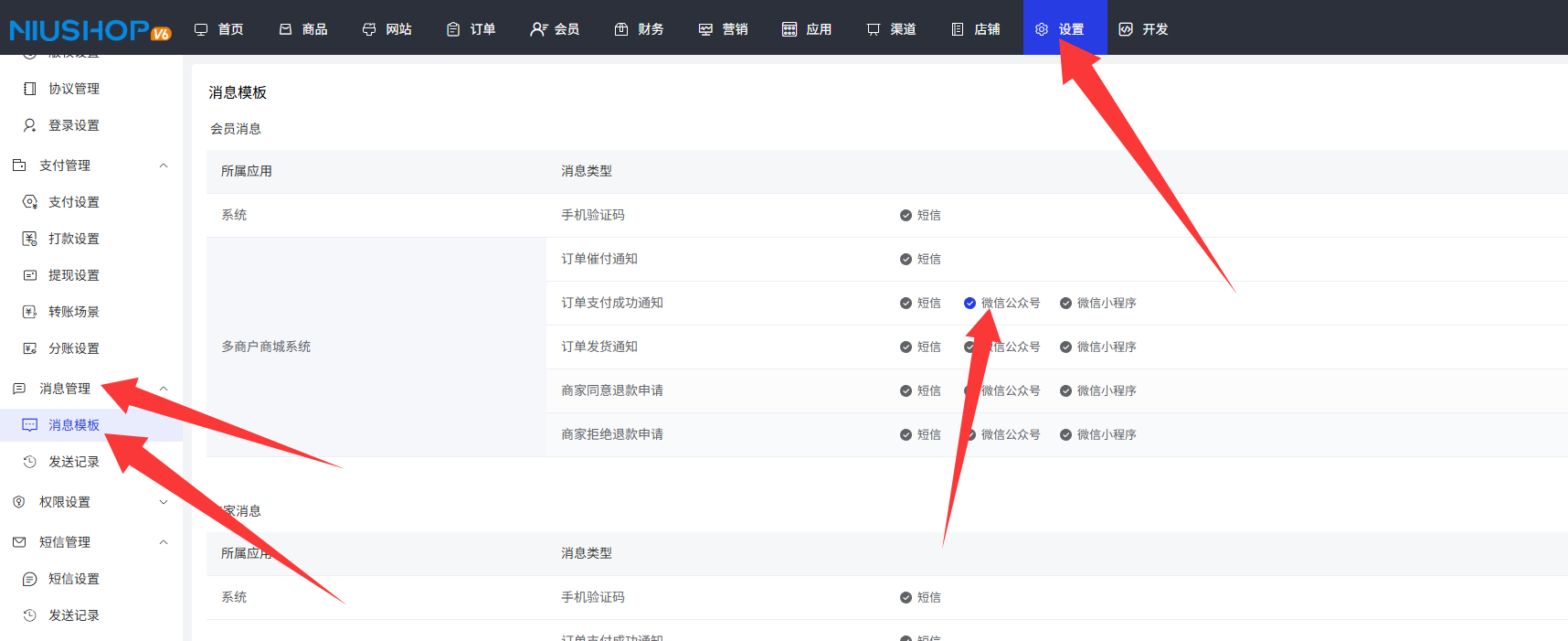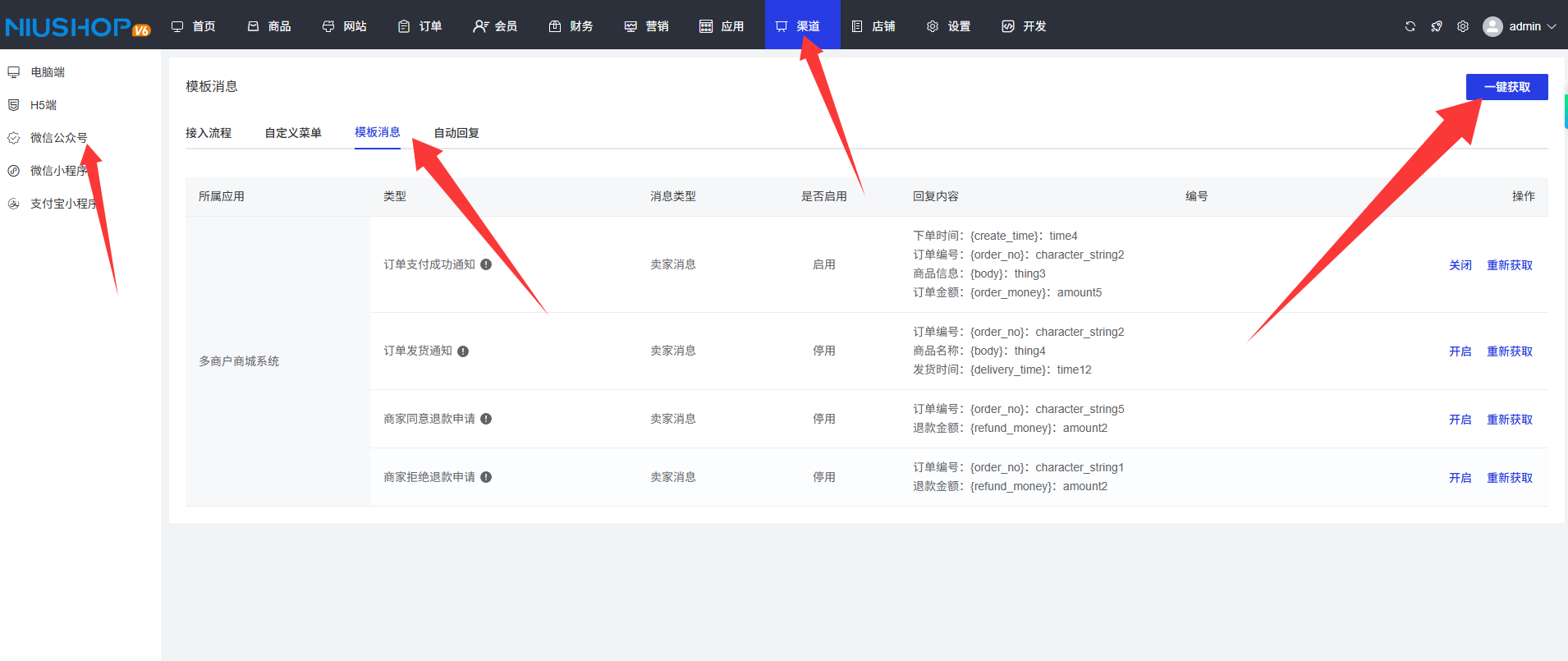 6.在后台点击渠道管理,选择微信公众号,点击模板消息,选择一键获取即可