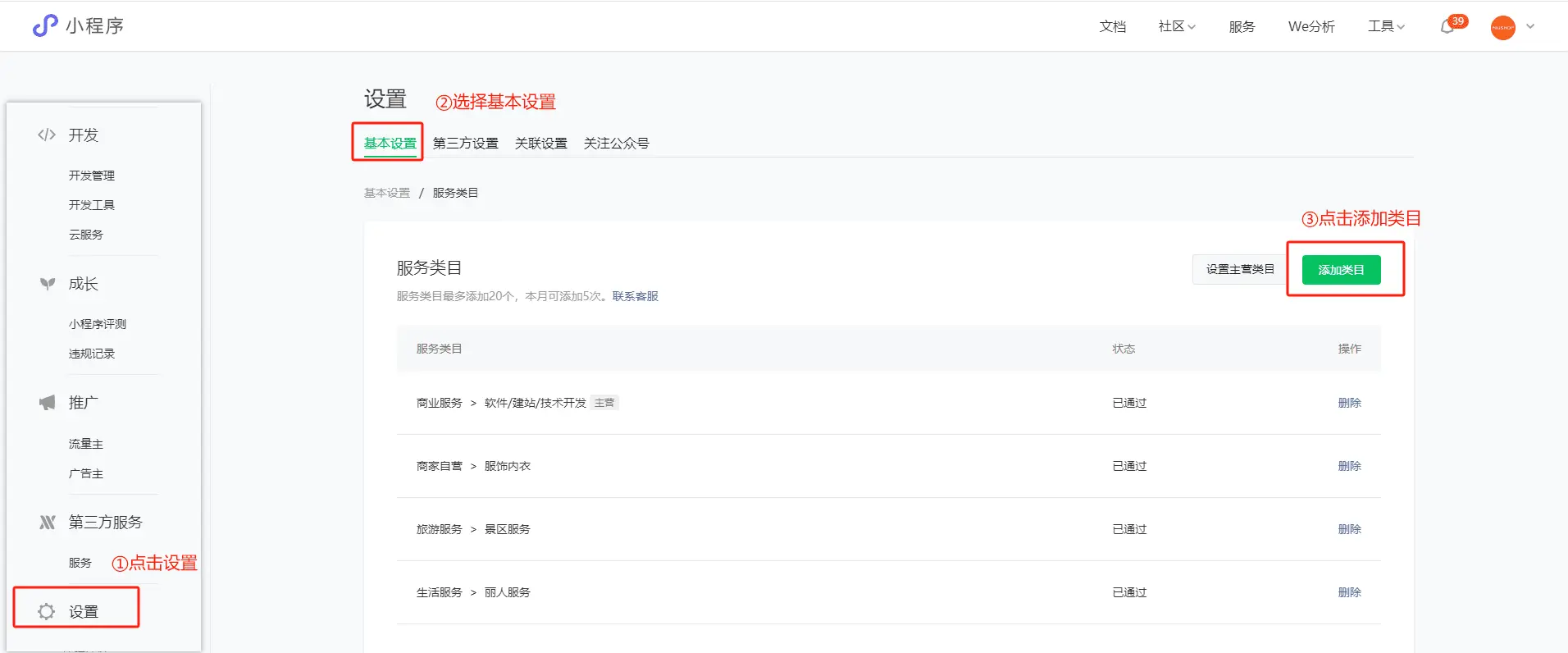 三、微信小程序消息模板配置 1.进入微信小程序平台,侧边栏点击设置,选择基本设置,点击添加类目