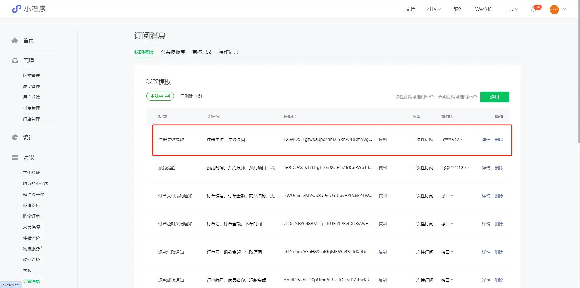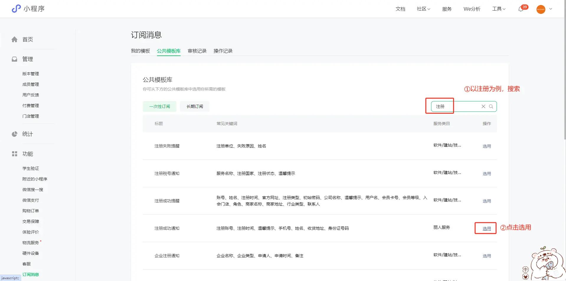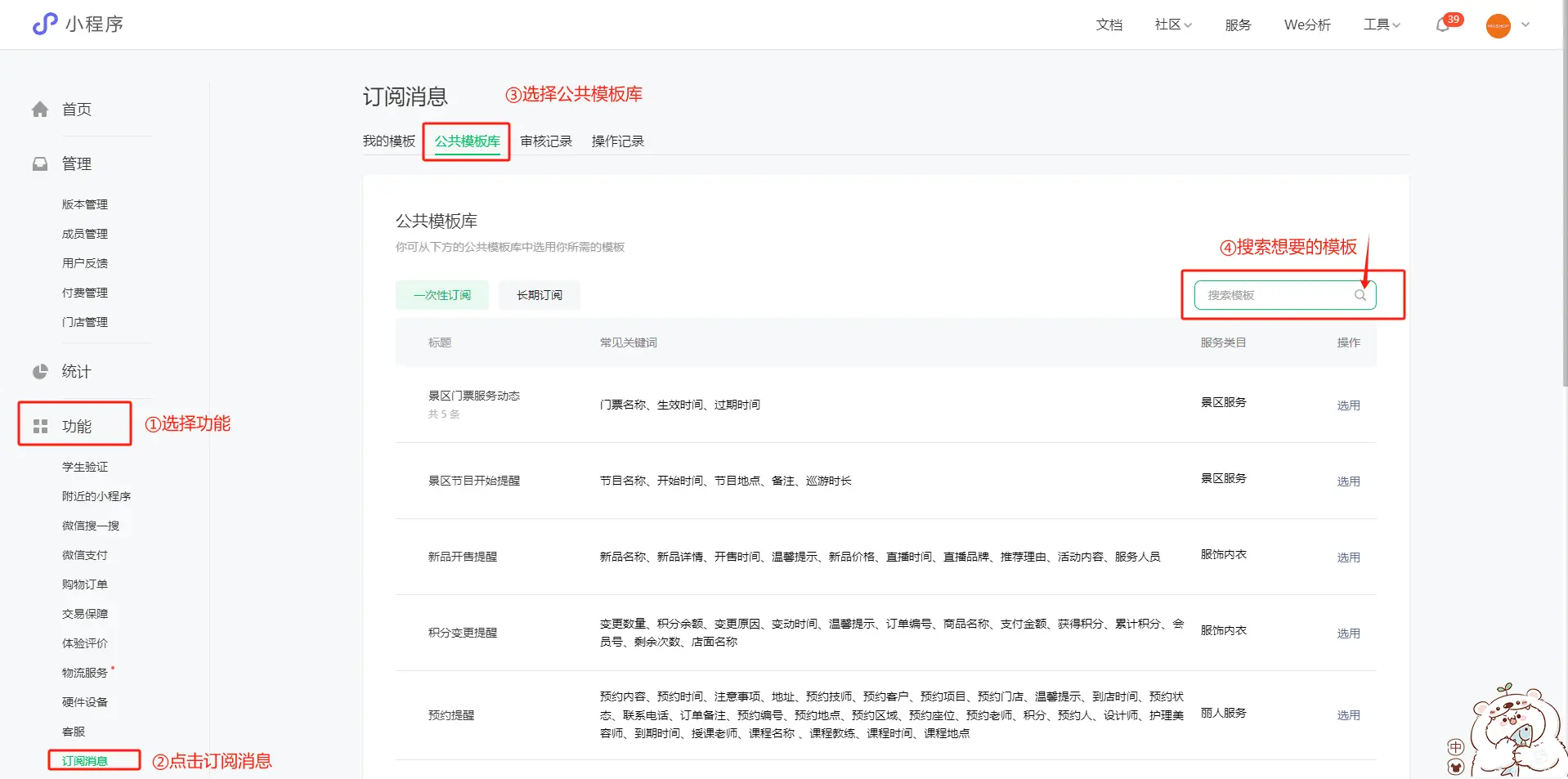 3.点击功能,选择订阅消息,点击公共模板库,搜索想要的模板