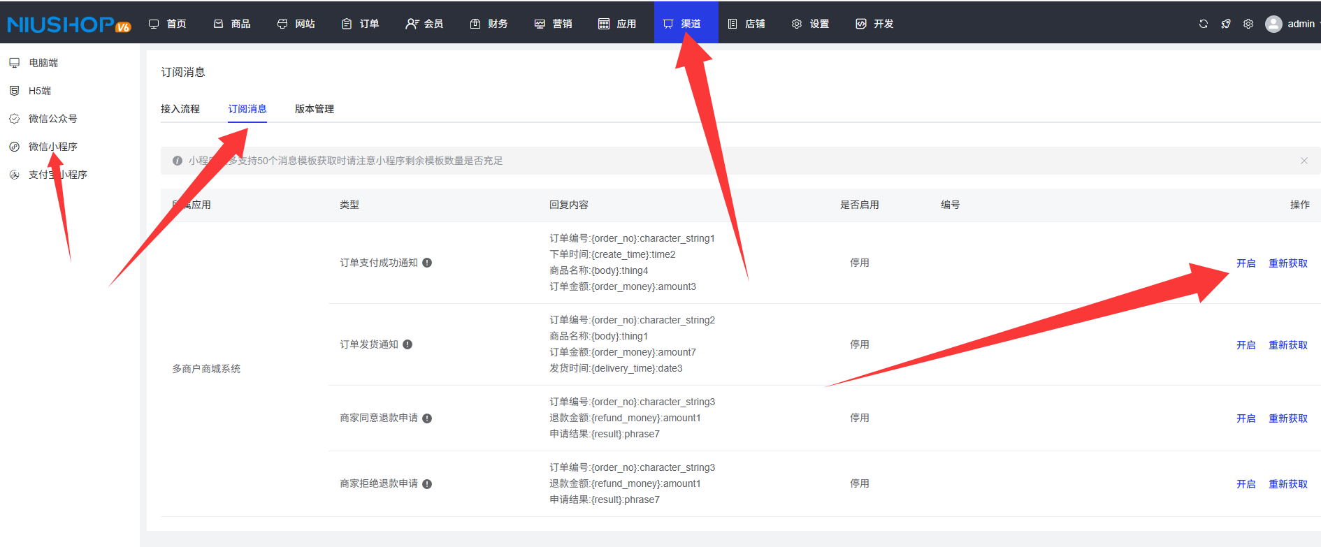 7.在后台中,选择渠道管理,点击微信小程序,选择订阅消息,点击获取即可