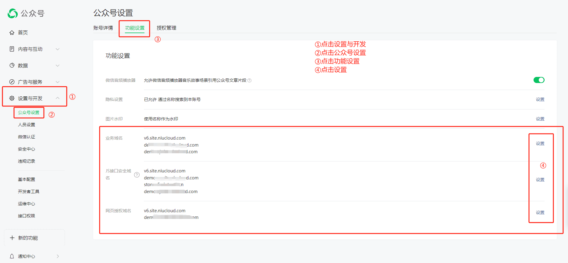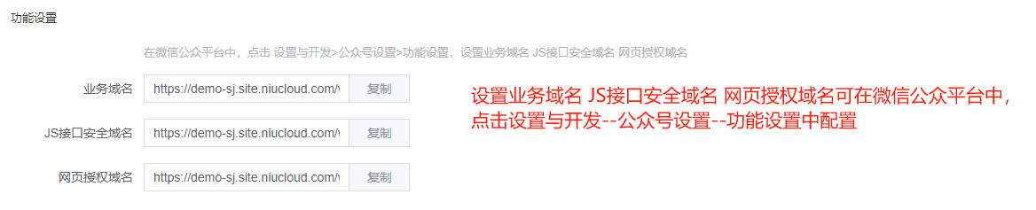 分别点击设置将域名复制到此处,后点击保存即可配置成功