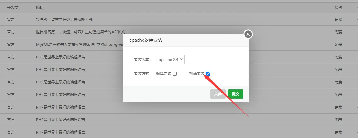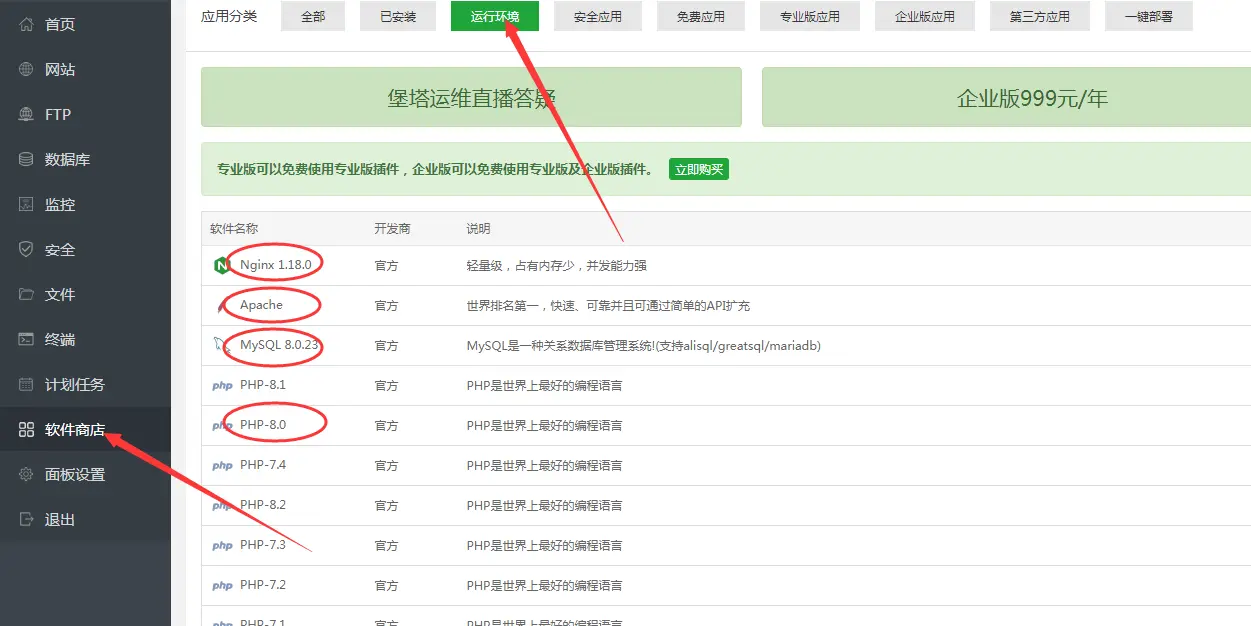 登录宝塔、点击【软件商店】--【运行环境】,安装php-8.0、mysql8.0、nginx/apache,选择极速安装: