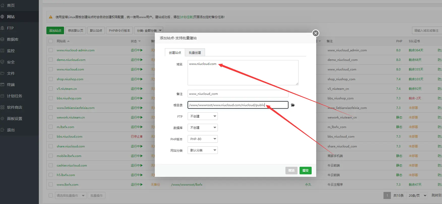 登录宝塔,点击【网站】--【添加站点】,填写域名,域名必须是已备案并且解析到该服务器ip上,备注可根据自己需要选填,根目录指向要具体到niucloud/public,ftp、数据库根据个人需要是否创建,php版本选择8.0:
