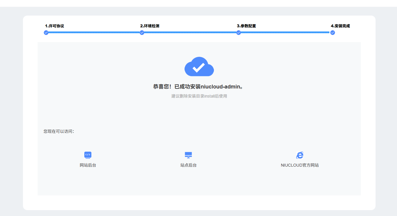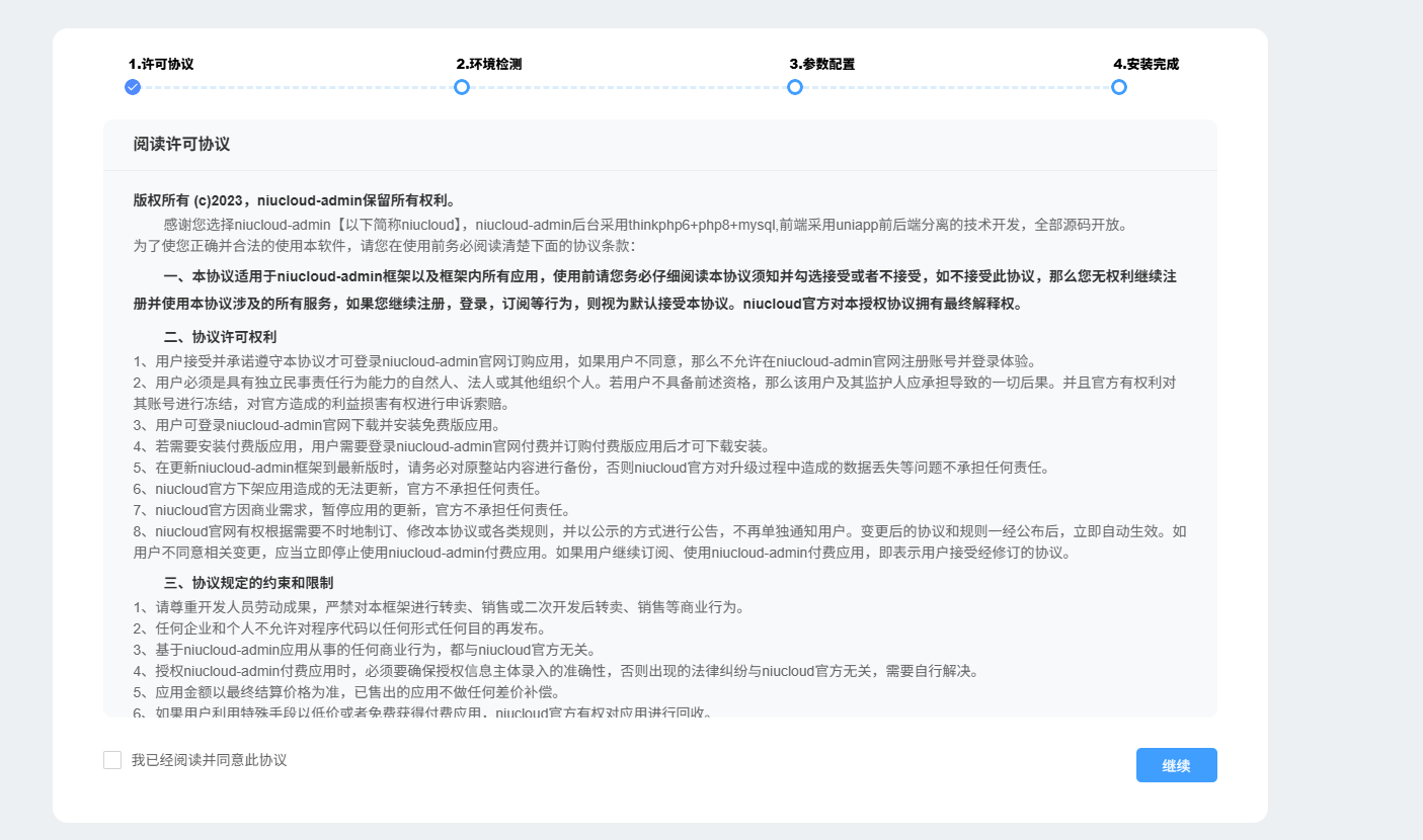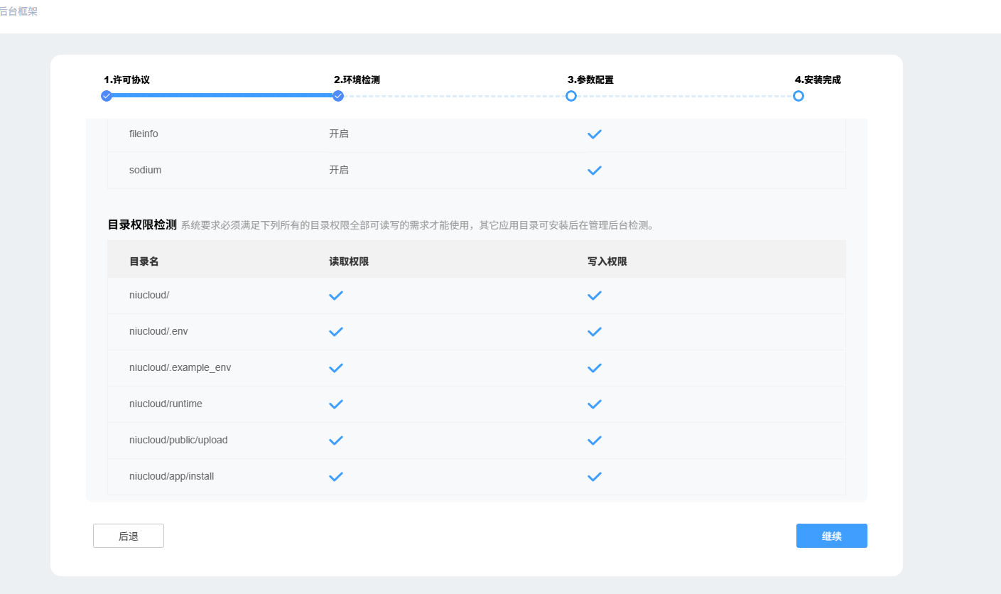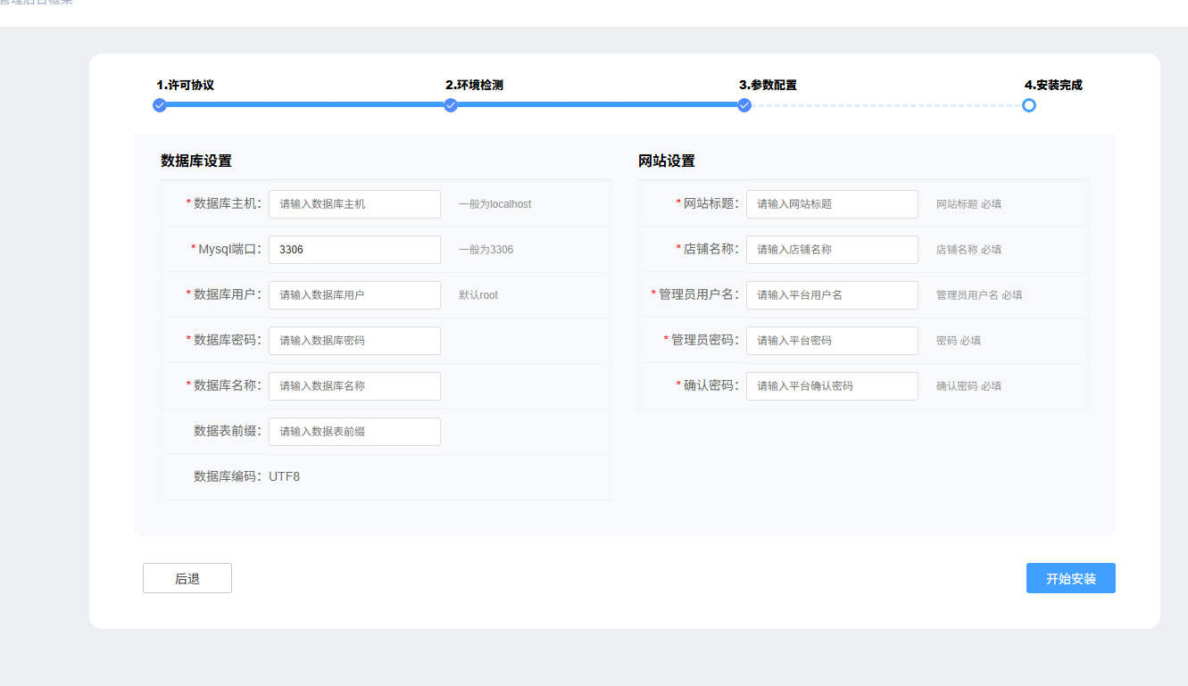 浏览器访问域名,即可进入安装页面,点击下一步校验扩展是否开启以及目录权限是否支持写入,如果所有条件均已符合,那么点击下一步即可进入参数配置界面,填写数据库设定以及网站设定(主机一般为localhost、mysql端口填写3306、数据库用户一般为root、数据库密码,在【数据库】--【root密码】中查看),填写完成后下一步就等待安装即可: