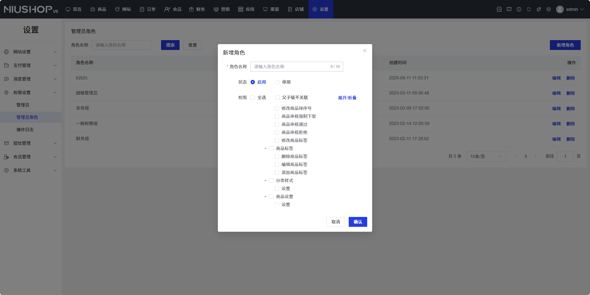 在管理员角色页面,点击「新增角色」按钮,进入新增角色页面: