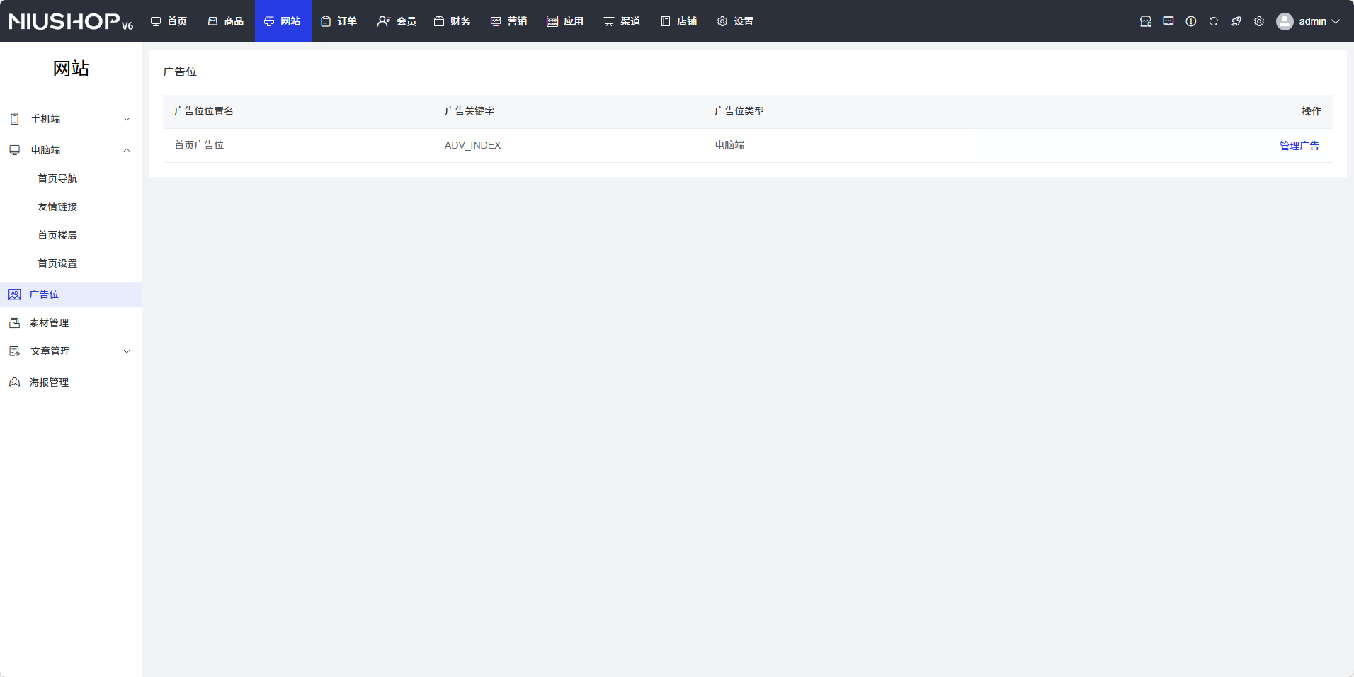 在广告位列表页面,找到需要管理的广告位,点击操作列中的「管理广告」按钮,进入该广告位的广告管理页面。