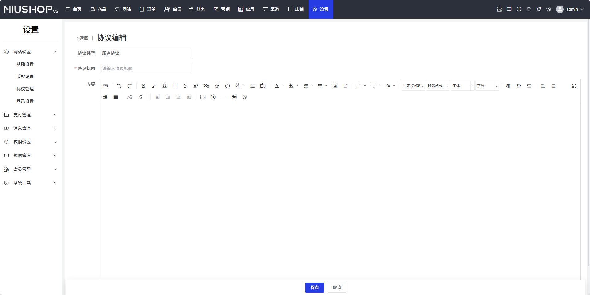 - 协议内容:在编辑器中输入协议的内容,可以使用编辑器的各种功能进行格式设置