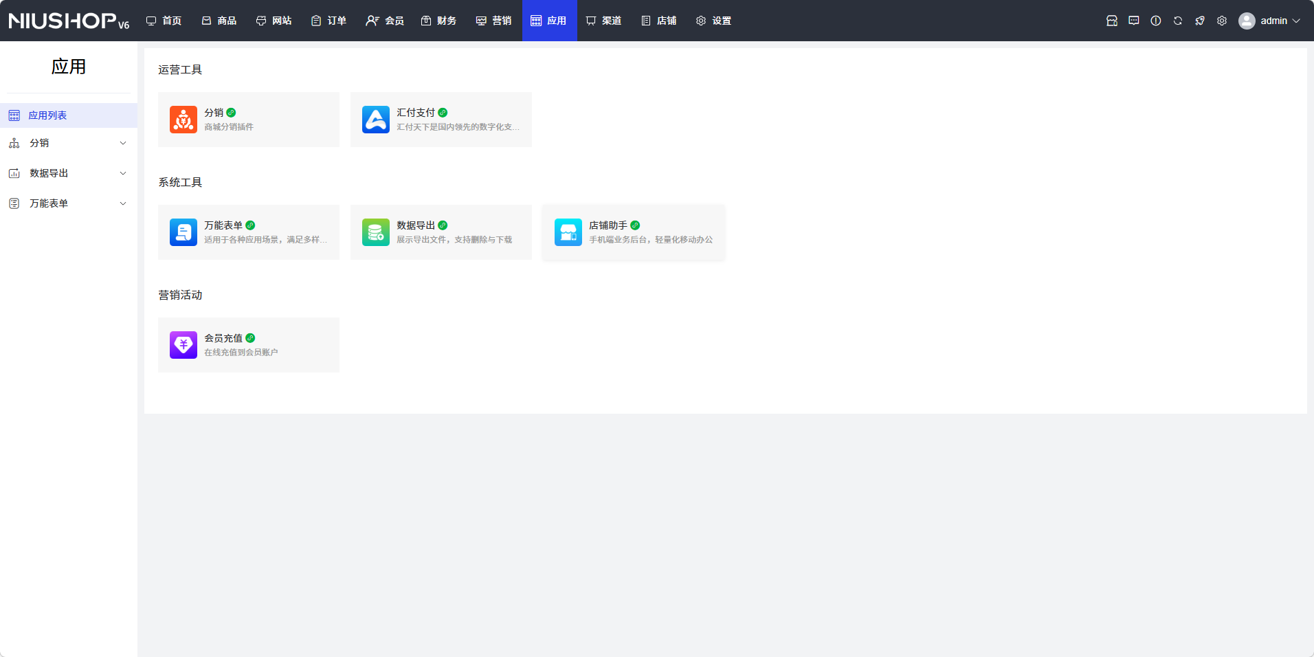 应用列表功能用于管理平台的各种应用工具,包括营销工具、系统工具和营销活动等。通过应用列表,管理员可以查看和管理平台已安装的应用,了解各应用的功能和状态。