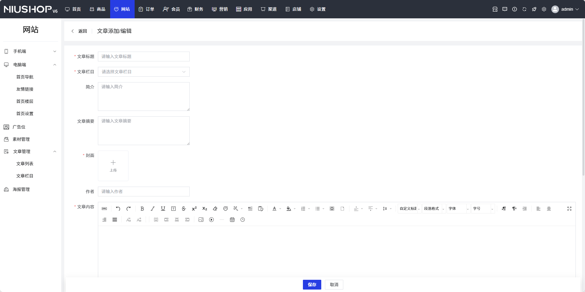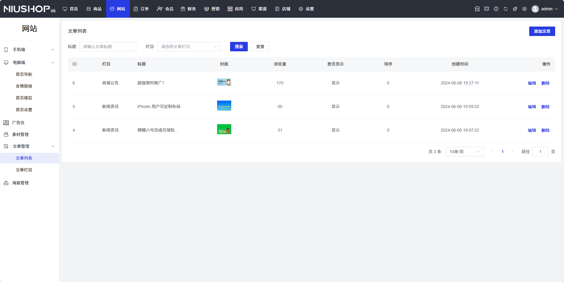 文章列表管理功能用于管理商城的文章,包括添加、编辑、删除文章,设置文章标题、栏目、封面、内容等。通过文章列表管理,可以发布和管理商城的各种资讯内容,提升用户体验。