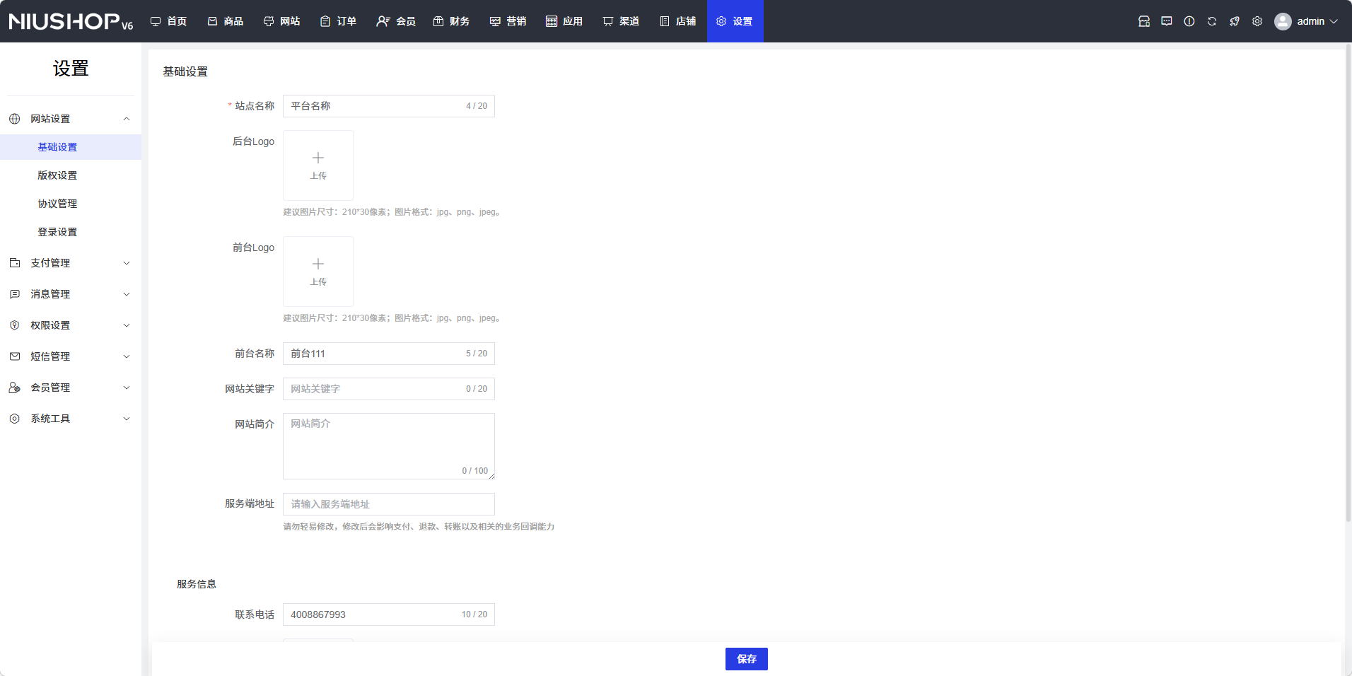 基础设置功能用于设置平台的基本信息,包括站点名称、后台logo、前台logo、前台名称、网站关键字、网站简介、服务端地址、联系电话、公众号二维码、客服二维码等。通过基础设置,可以定制平台的基本信息,提升平台的品牌形象。