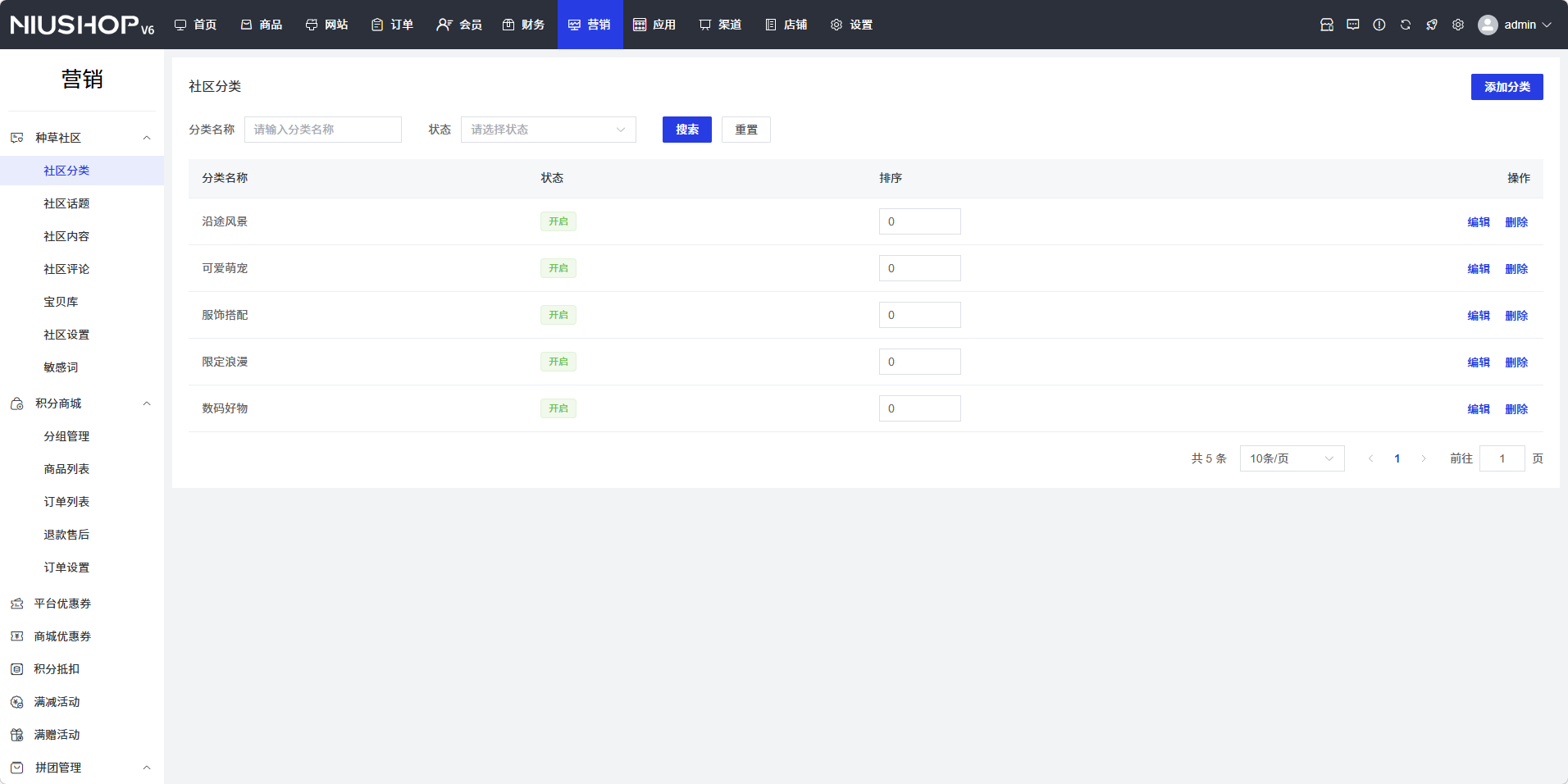 社区分类功能用于管理种草社区的分类,包括添加、编辑、删除分类,设置分类名称、排序和状态等。通过社区分类管理,可以对社区内容进行分类组织,方便用户浏览和管理。