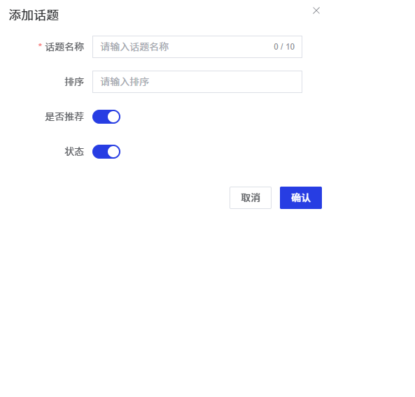 点击页面右上角的「添加话题」按钮,在弹出的「添加话题」对话框中填写以下信息: