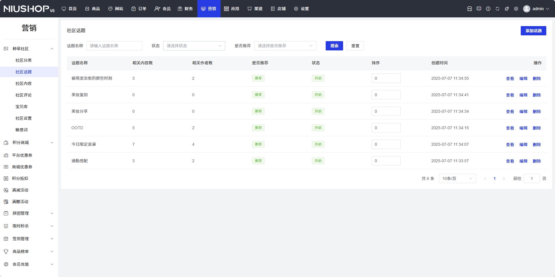 社区话题功能用于管理种草社区的话题,包括添加、编辑、删除话题,设置话题名称、排序、状态和是否推荐等。通过社区话题管理,可以引导用户围绕特定主题进行讨论,增加社区活跃度。