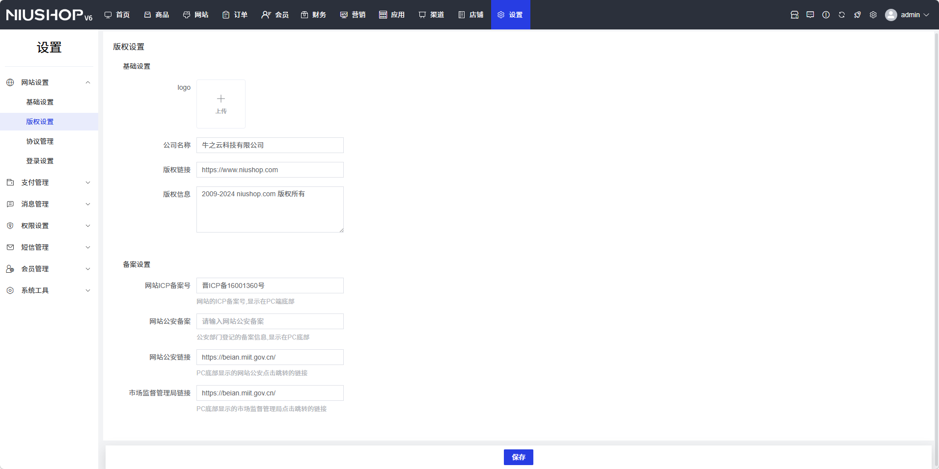 版权设置功能用于设置平台的版权相关信息,包括基础设置(logo、公司名称、版权链接、版权信息)和备案设置(网站ICP备案号、网站公安备案号、网站公安链接、布防治安管理链接)。通过版权设置,可以保护平台的知识产权,确保平台的合法性。