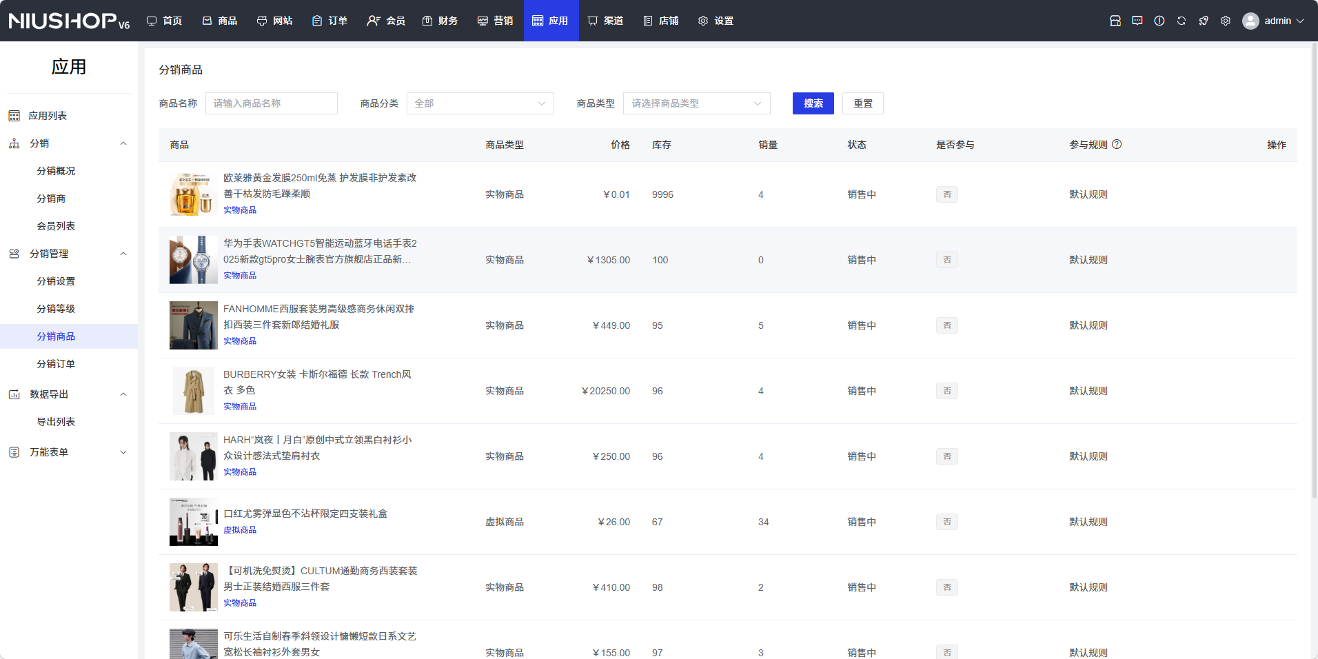 分销商品功能用于管理平台的分销商品,包括查看分销商品列表、搜索分销商品、设置分销商品的参与规则等。通过分销商品管理,可以控制哪些商品参与分销,以及设置不同商品的分销规则。