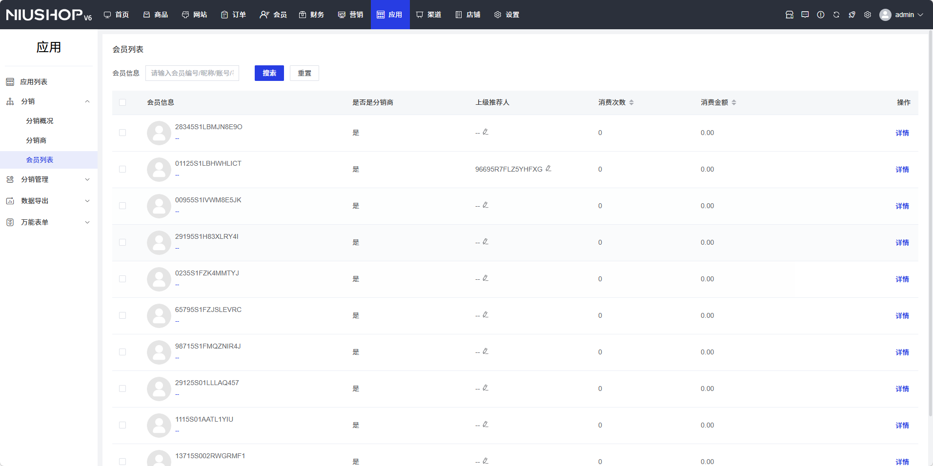 会员列表功能用于查看平台的会员信息,包括会员基本信息、是否是分销商、上级推荐人、消费次数、消费金额等。通过会员列表,管理员可以了解会员的基本情况,分析会员的消费行为。