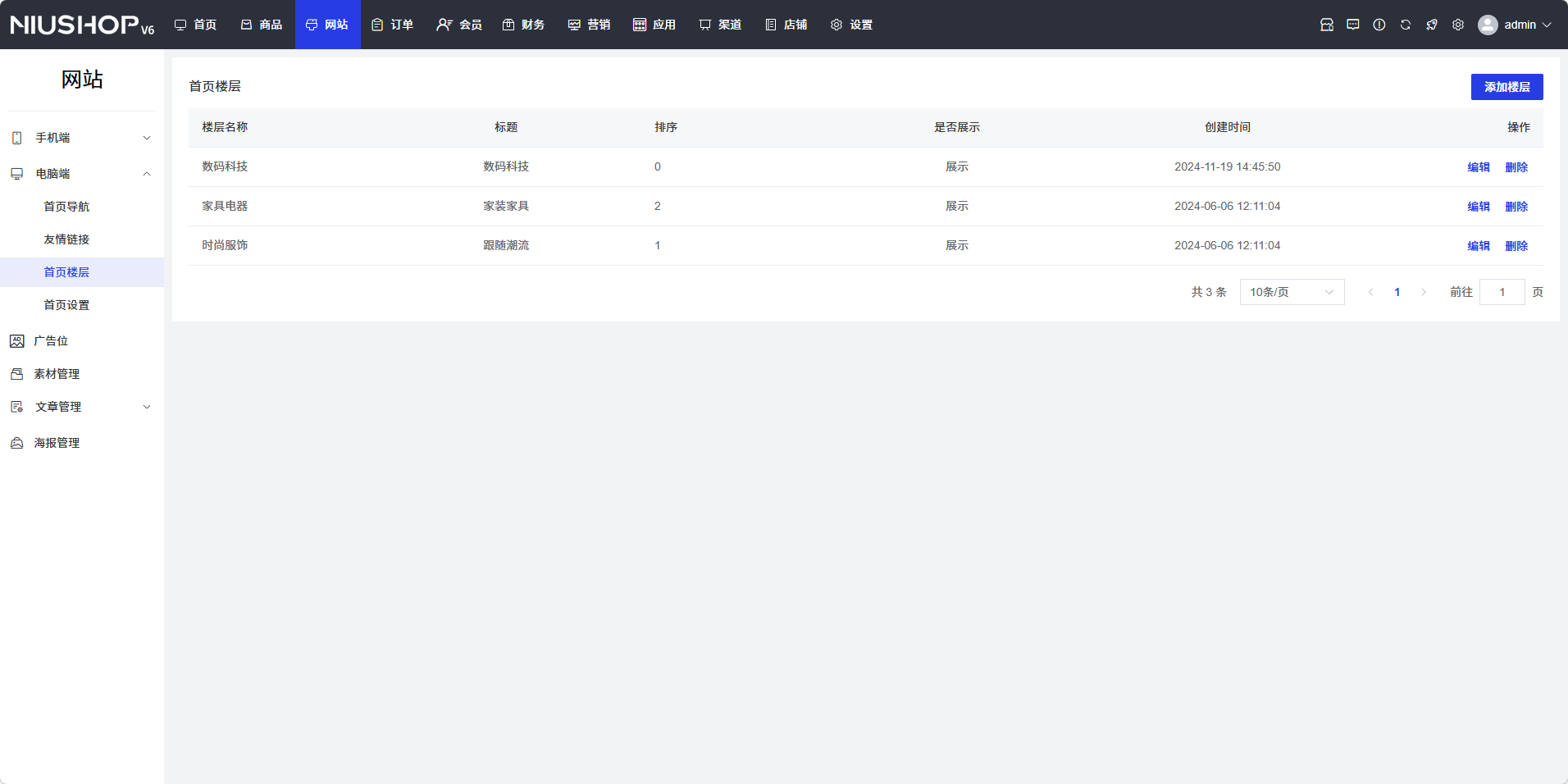 首页楼层管理功能用于配置商城首页的楼层信息,包括添加、编辑、删除楼层,设置楼层名称、标题、排序等。通过首页楼层配置,可以为用户提供分类展示商品的区域,提升用户体验。