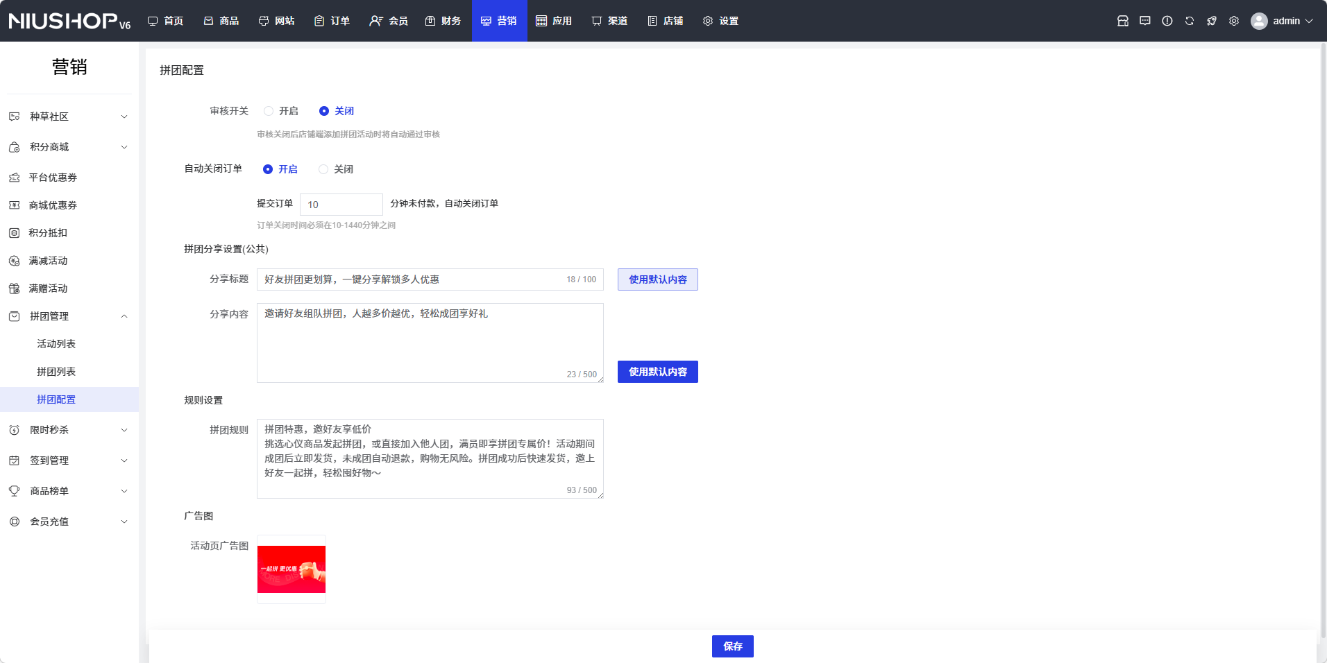 - 说明:关闭后店铺端添加拼团活动时将自动通过审核