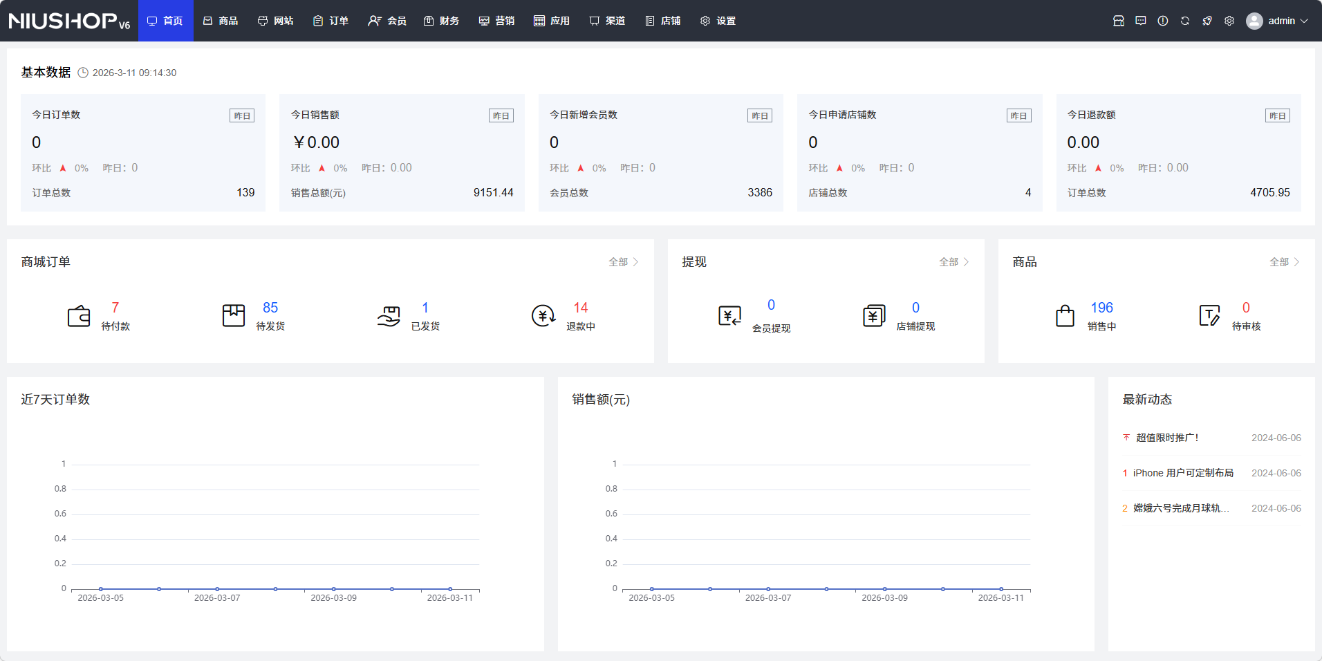 首页是系统的核心数据展示页面,提供了商城运营的关键数据统计和实时状态监控。通过首页,管理员可以快速了解商城的整体运营情况,包括订单、销售、会员等核心数据。