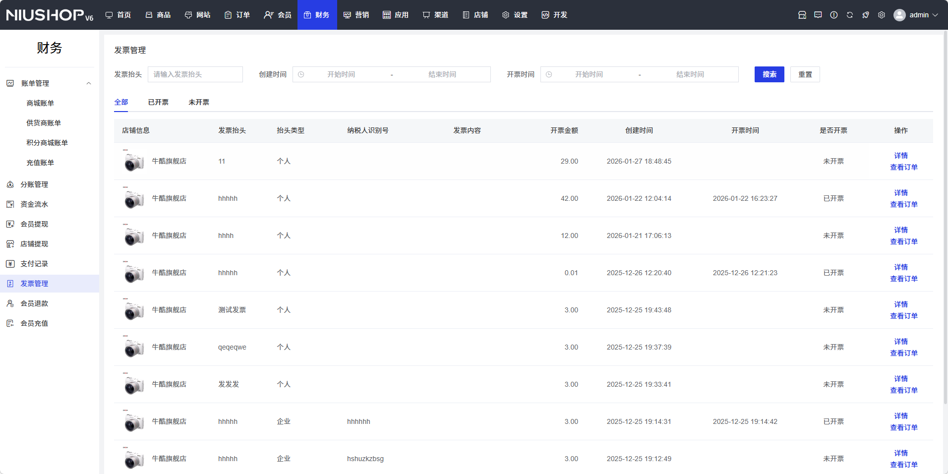 发票管理功能用于查看和管理订单的发票申请,包括店铺信息、发票抬头、抬头类型、纳税人识别号、发票内容、开票金额、创建时间、开票时间、是否开票等信息,支持筛选、查看详情、查看订单等操作。