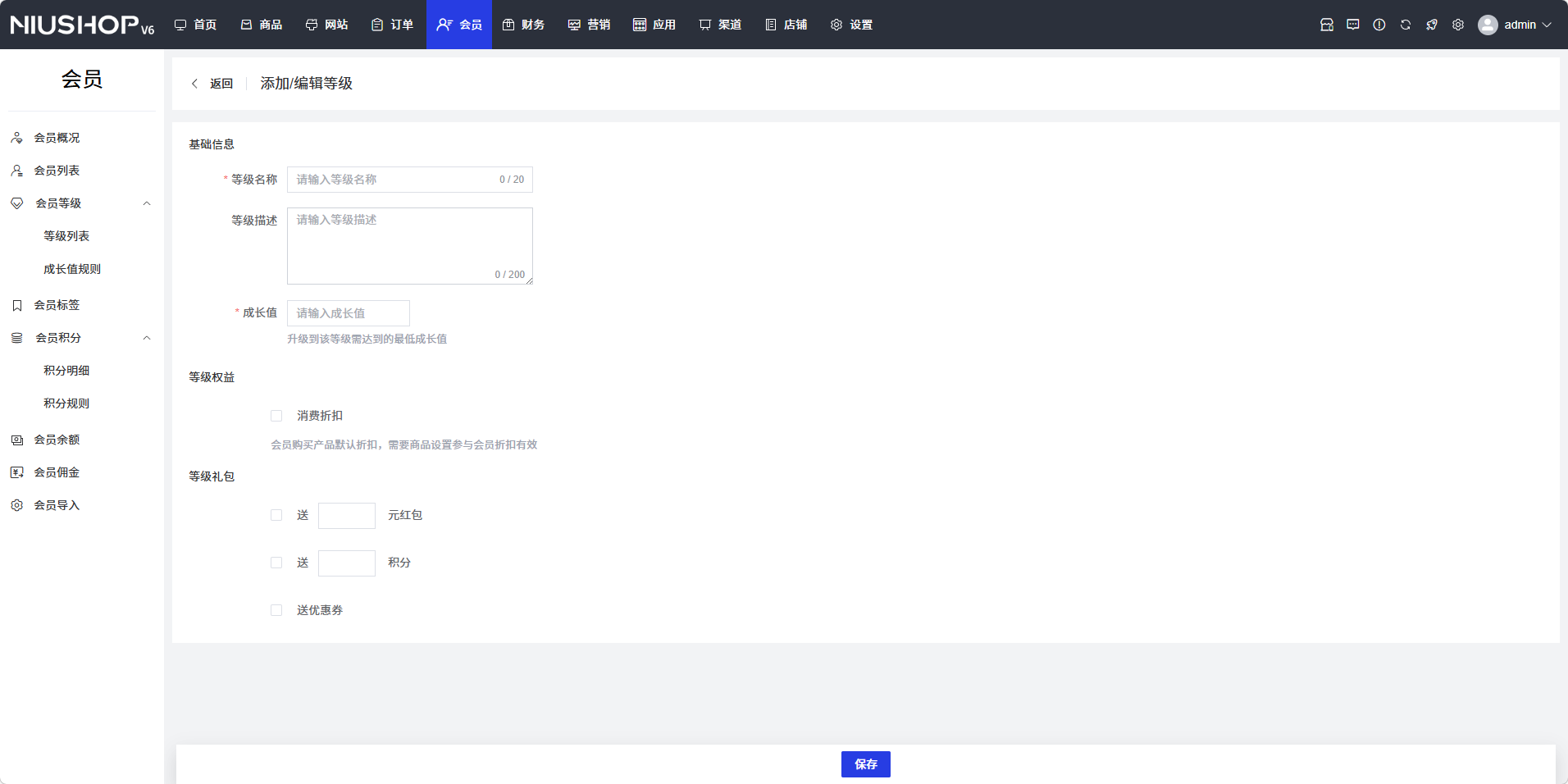 - 等级礼包:选择是否赠送红包、积分、优惠券 点击「保存」按钮,新等级将被添加。