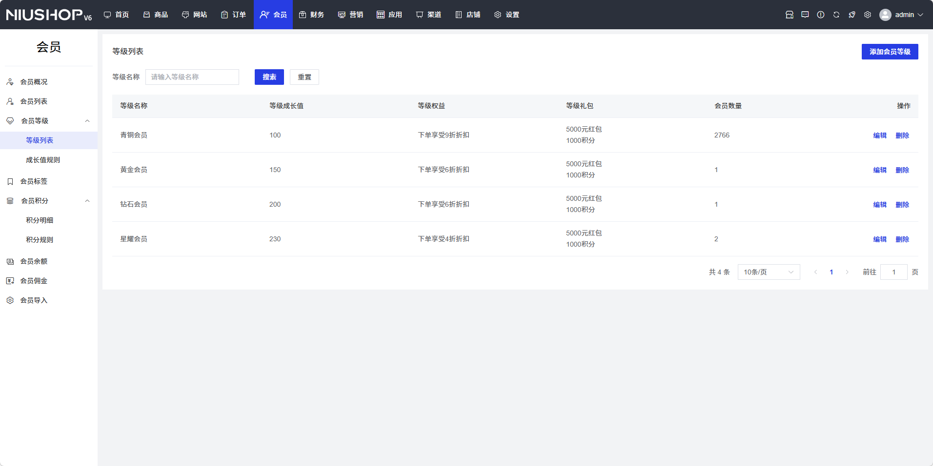 等级列表功能用于管理商城的会员等级,包括添加、编辑、删除会员等级,设置等级名称、等级成长值、等级权益和等级礼包等。通过等级列表,商家可以设置不同的会员等级体系,激励会员消费和活跃。