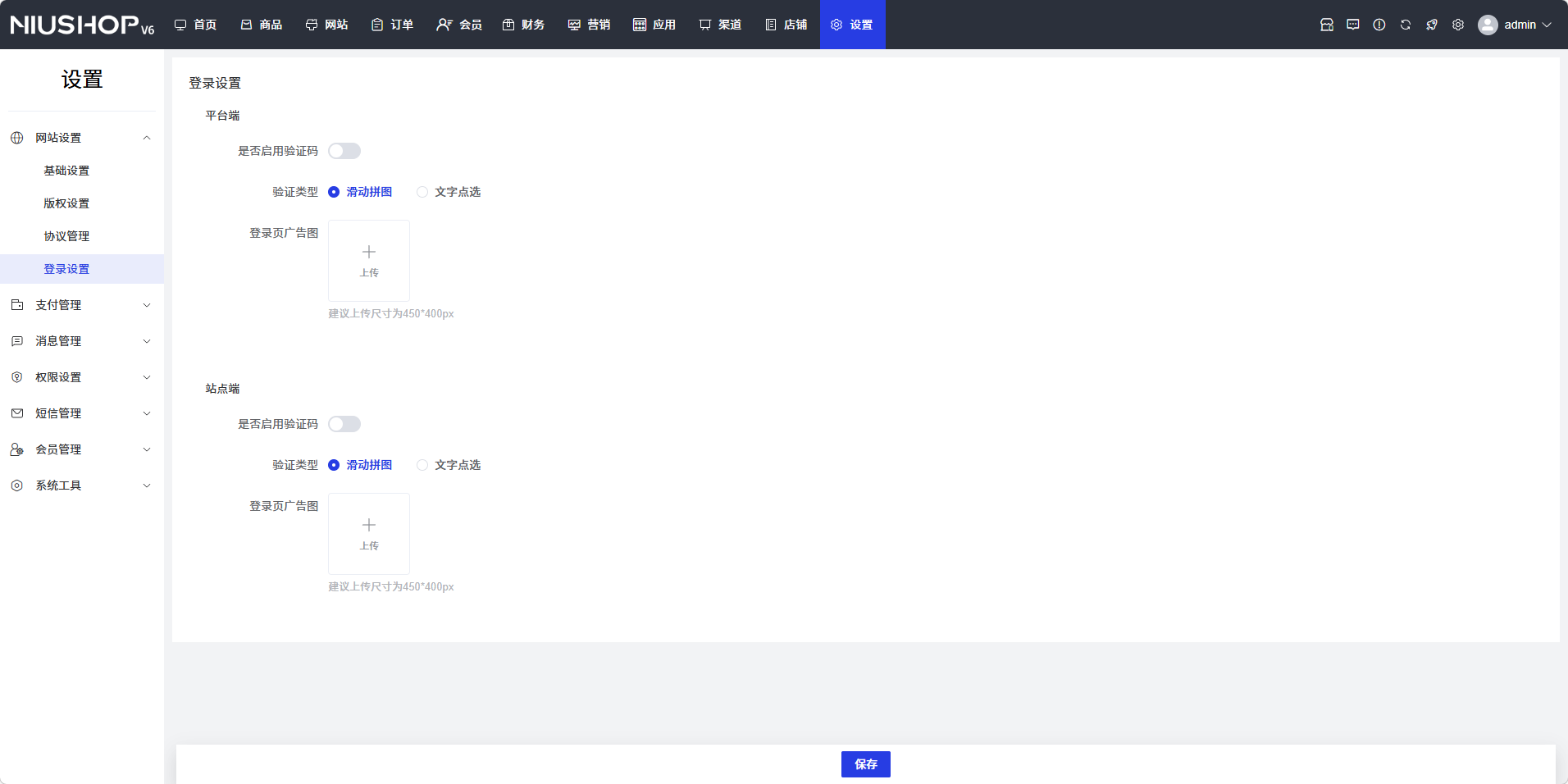 - 是否开启验证码:开启或关闭站点端的登录验证码