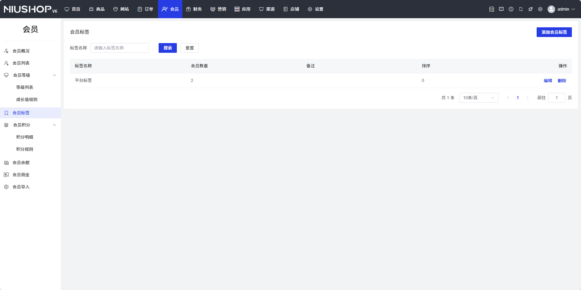 找到需要删除的会员标签,点击操作列中的「删除」按钮,在弹出的确认对话框中点击「确认」按钮,标签将被删除。