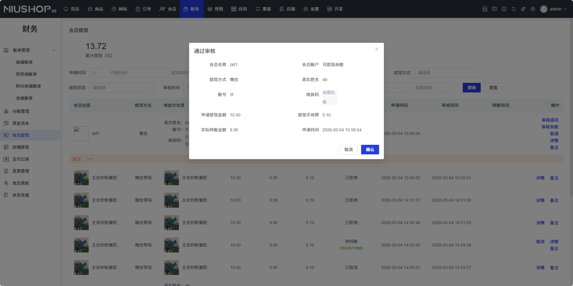 - 查看会员名称、会员账户、可提现余额、提现方式、真实姓名、收款码、账号、申请提现金额、实际转账金额、提现手续费、申请时间等信息