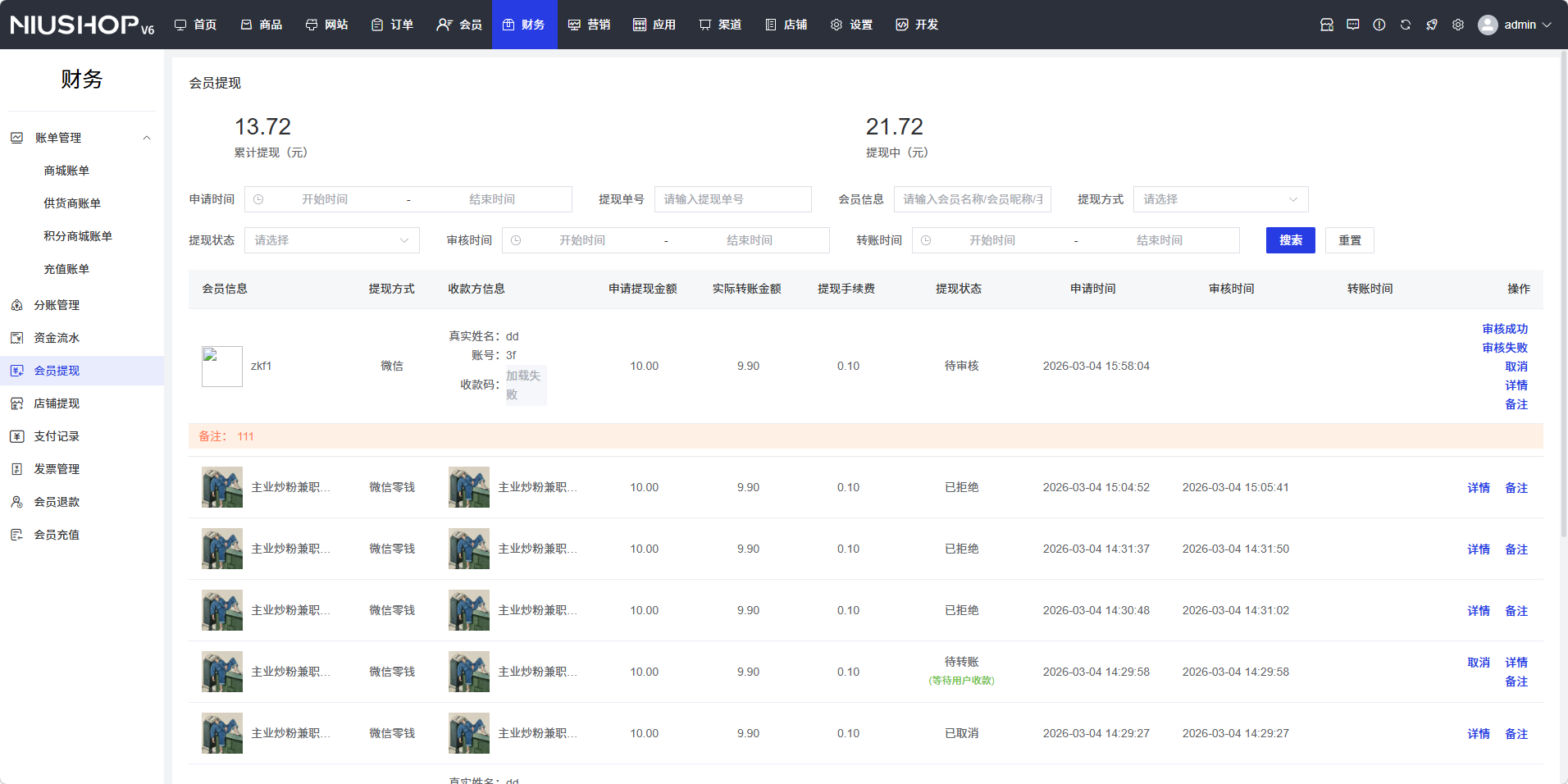 在提现列表中,查看会员的提现记录,包括会员信息、提现方式、收款方信息、申请提现金额、实际到账金额、提现手续费、提现状态、申请时间、审核时间、转账时间等信息。