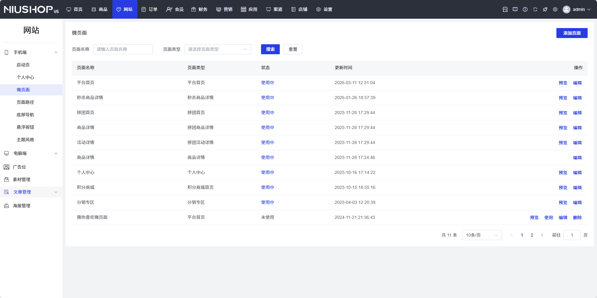 微页面管理功能用于创建、编辑和管理商城的各种微页面,包括平台首页、秒杀商品详情、拼团页面等多种类型的页面。通过微页面管理,可以为用户提供丰富的营销和展示页面。