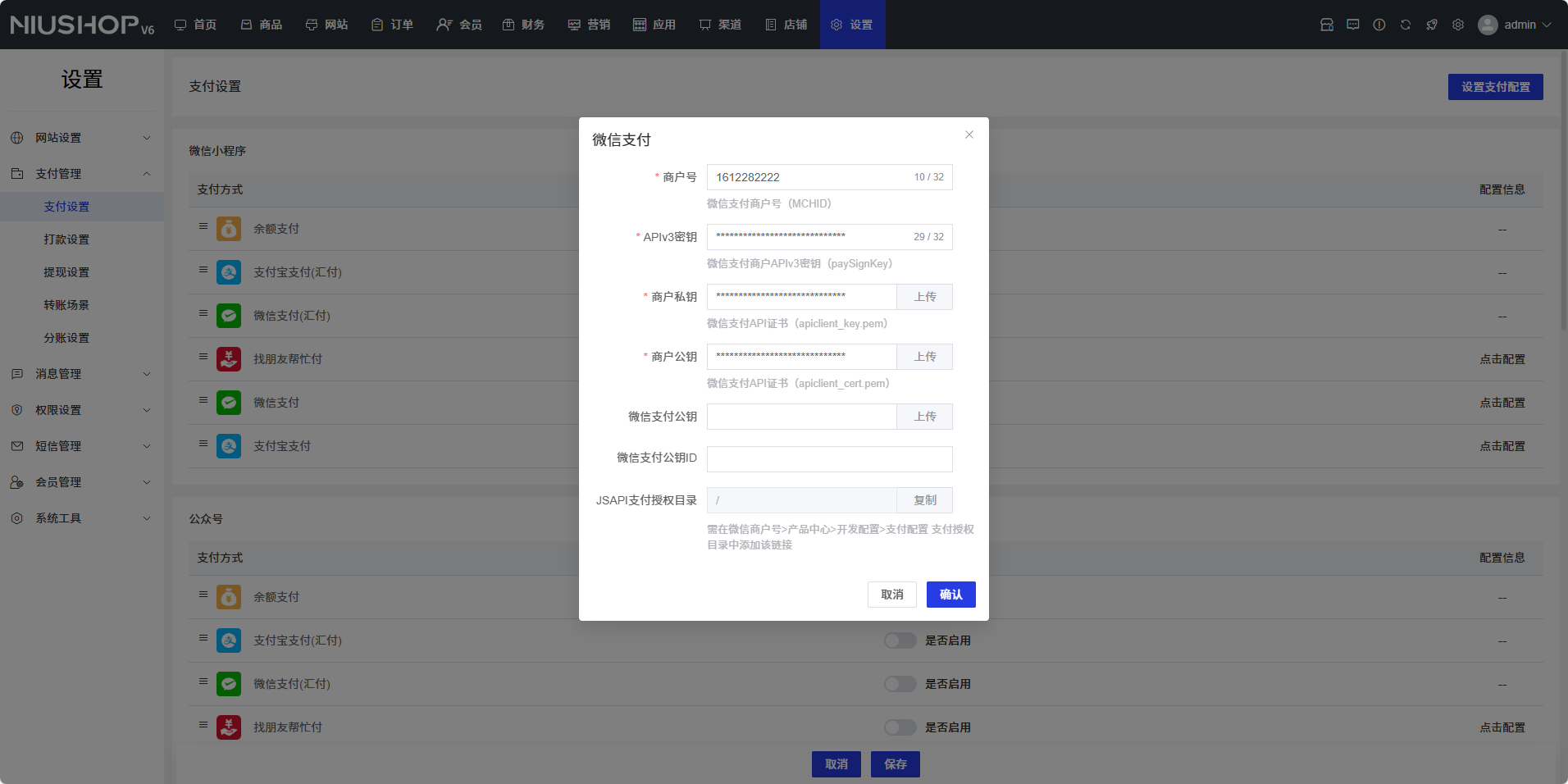 - 点击「确认」按钮,保存微信支付的配置