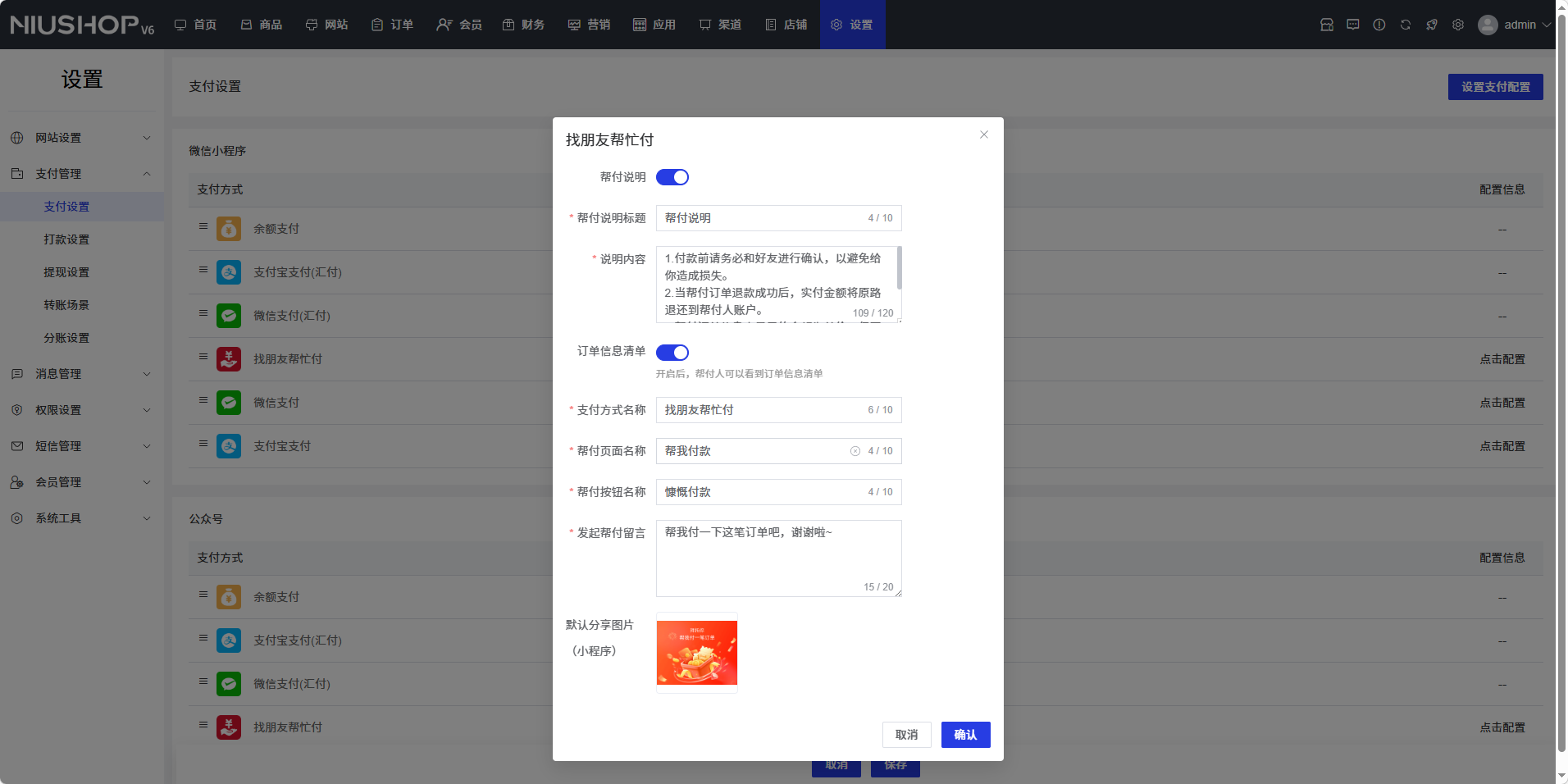 - 是否启用:开启或关闭找朋友代付