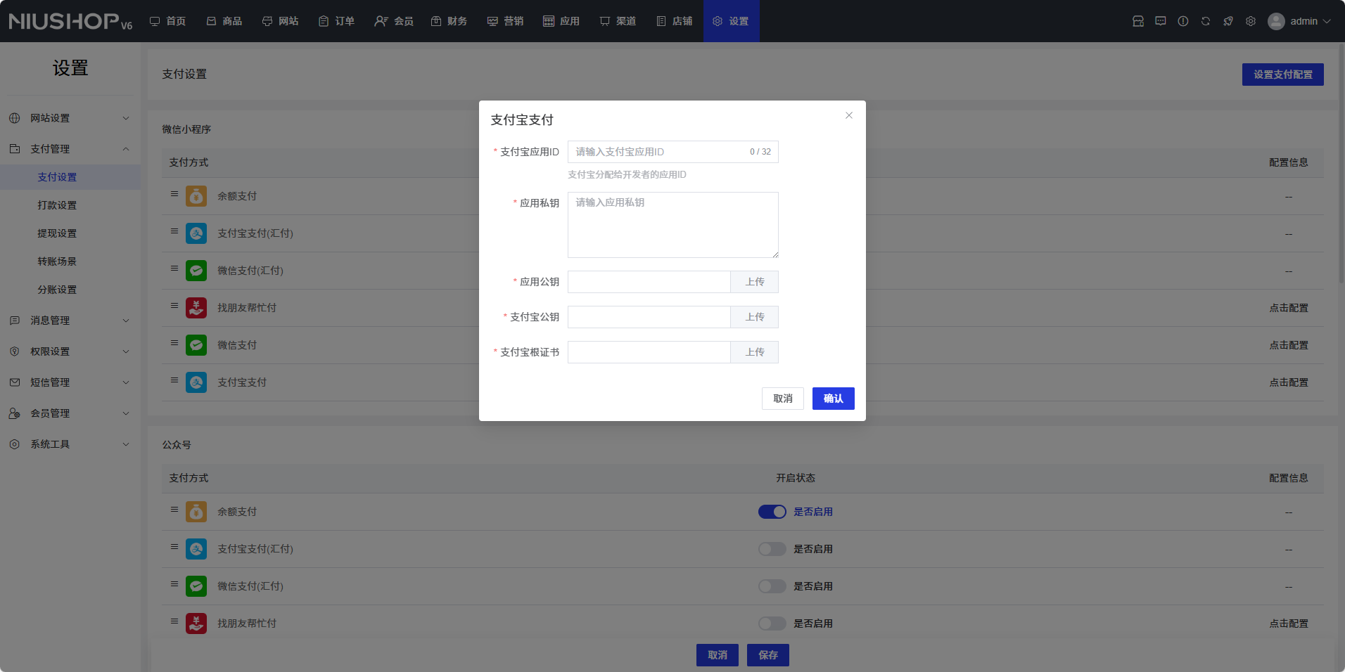 - 支付宝支付:开启或关闭支付宝支付