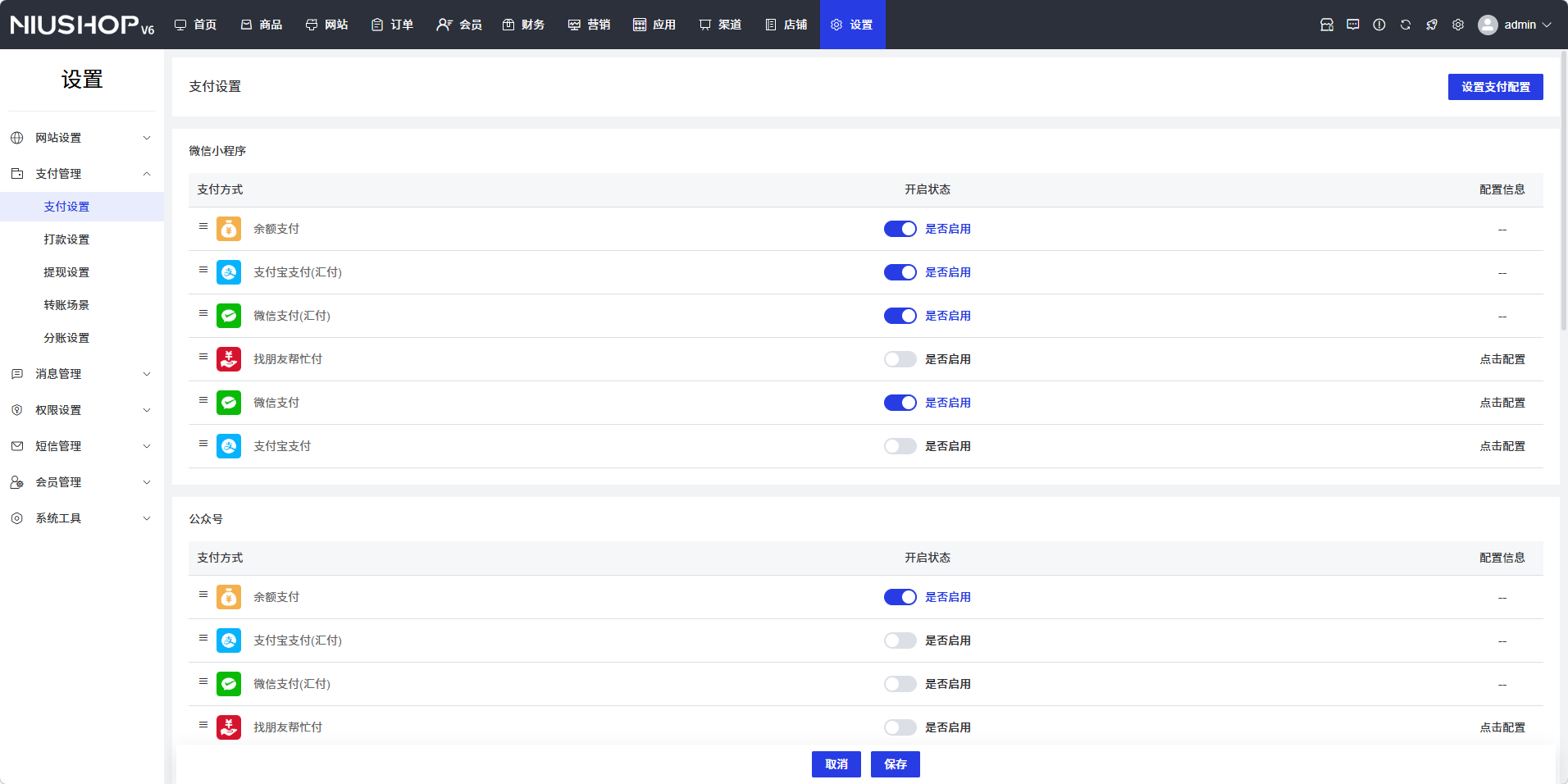 - 余额支付:开启或关闭余额支付