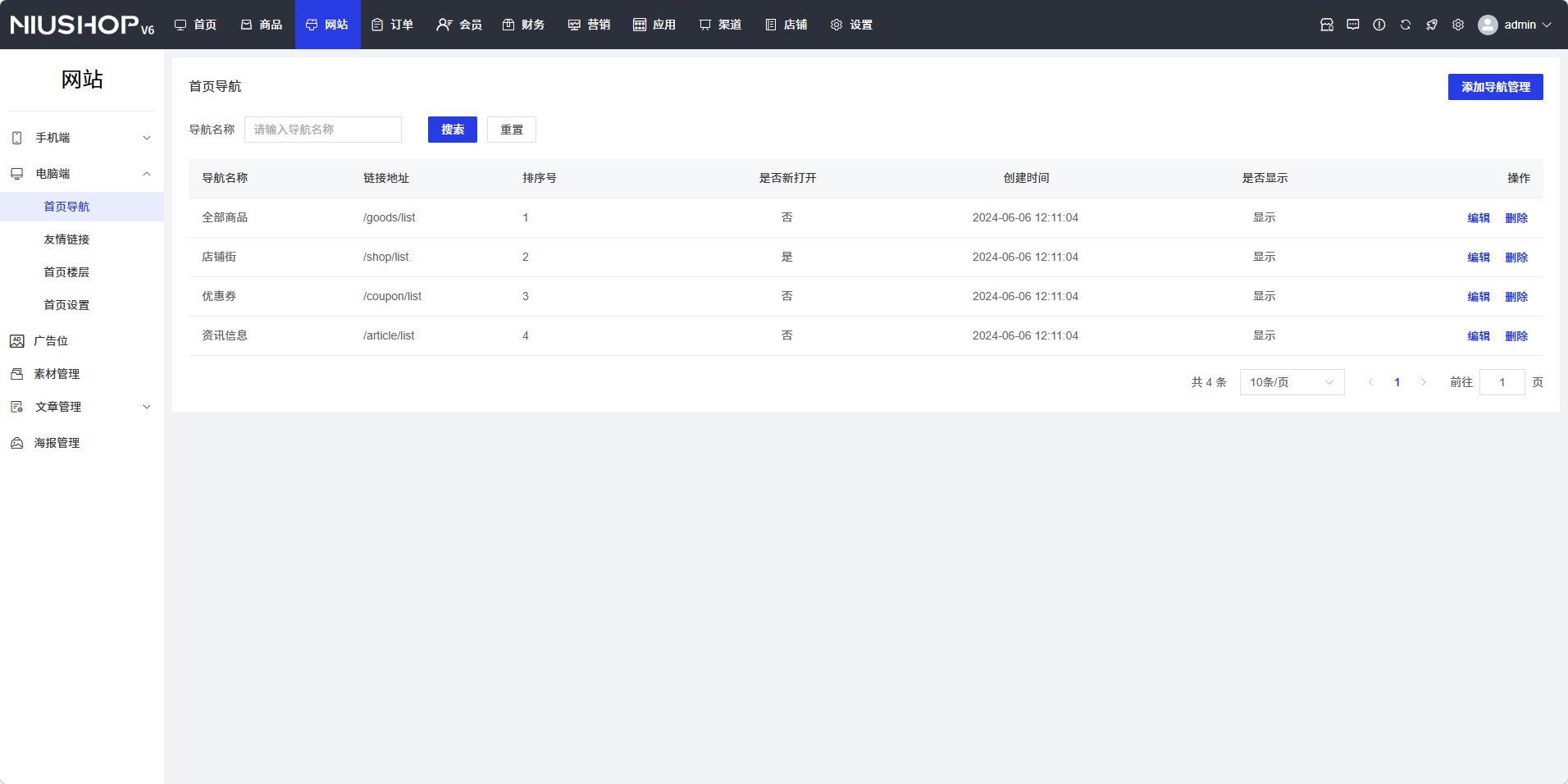 首页导航管理功能用于配置商城电脑端的导航栏,包括添加、编辑、删除导航项,设置导航链接、排序等。通过首页导航配置,可以为用户提供便捷的页面访问入口。