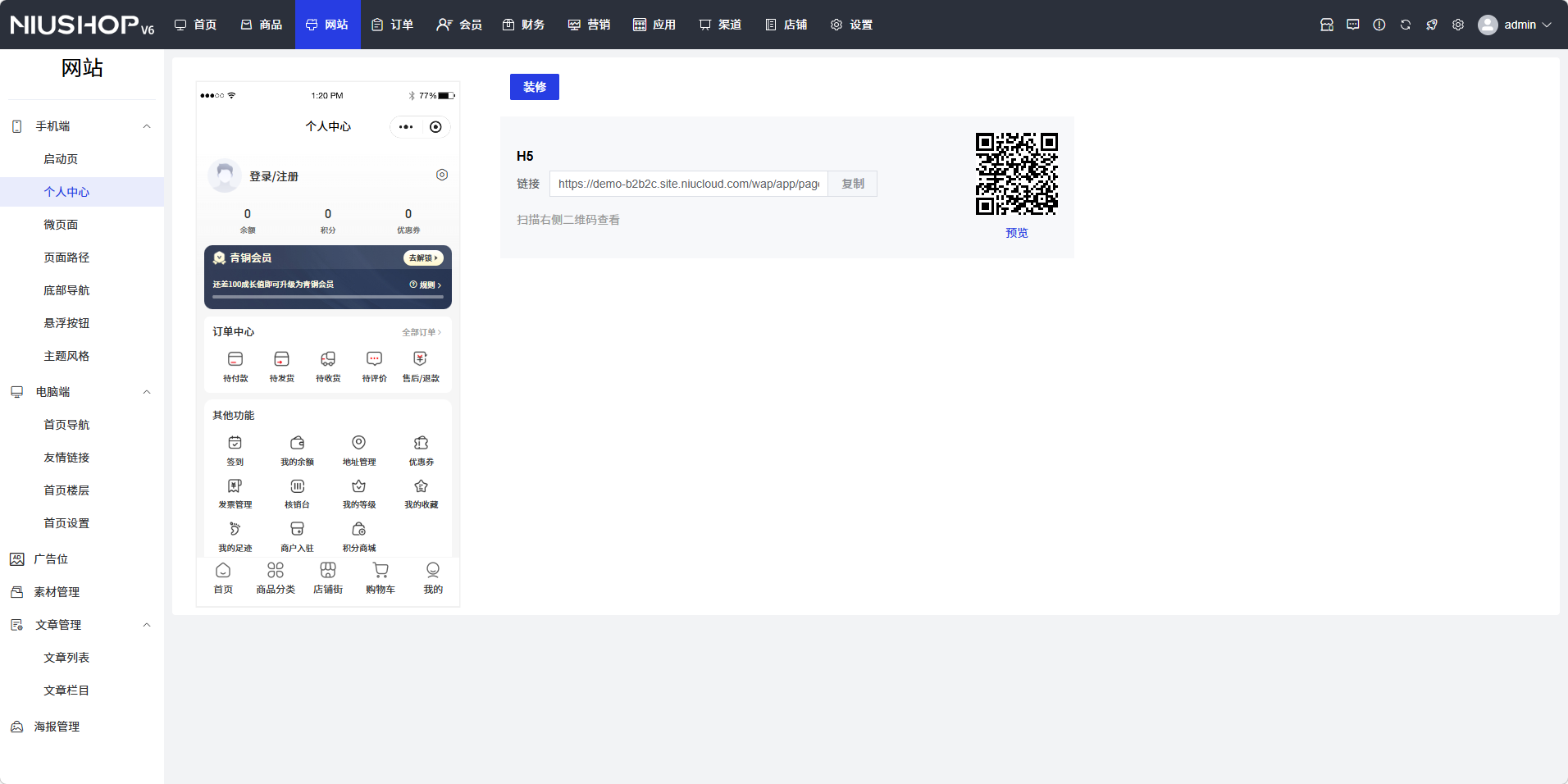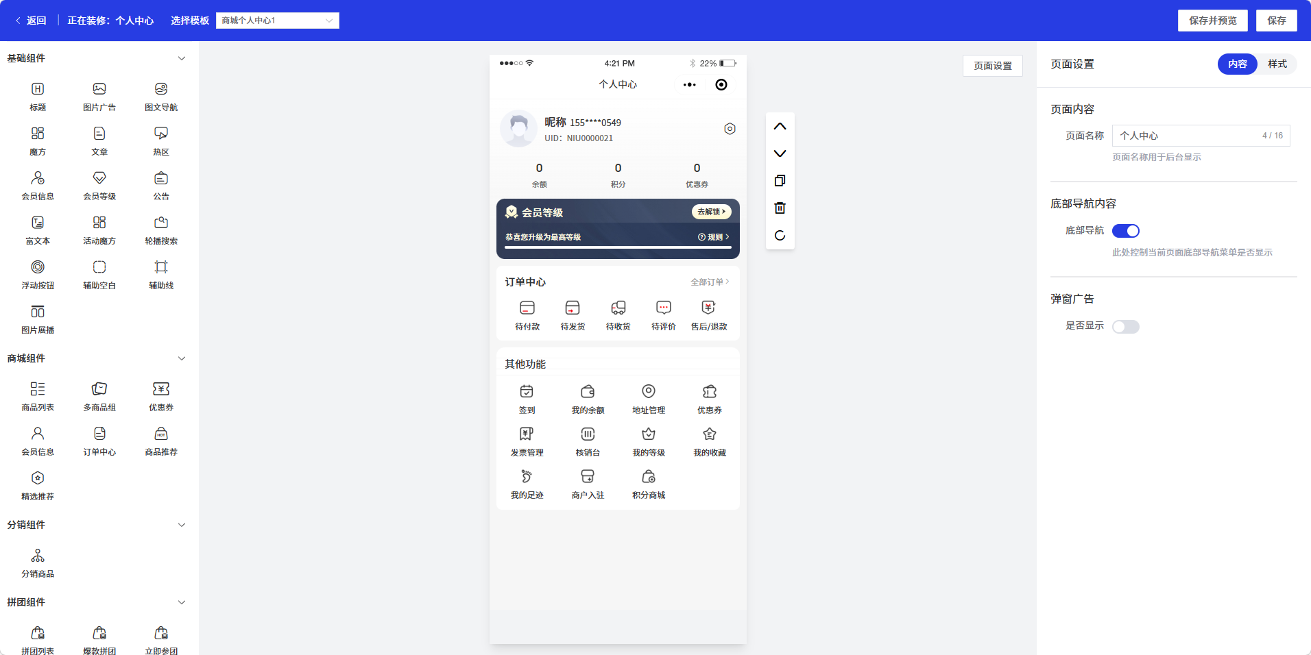 个人中心页面用于配置商城移动端的个人中心页面,包括设置个人中心链接、预览效果等功能。通过个人中心配置,可以为用户提供统一的个人信息管理入口。