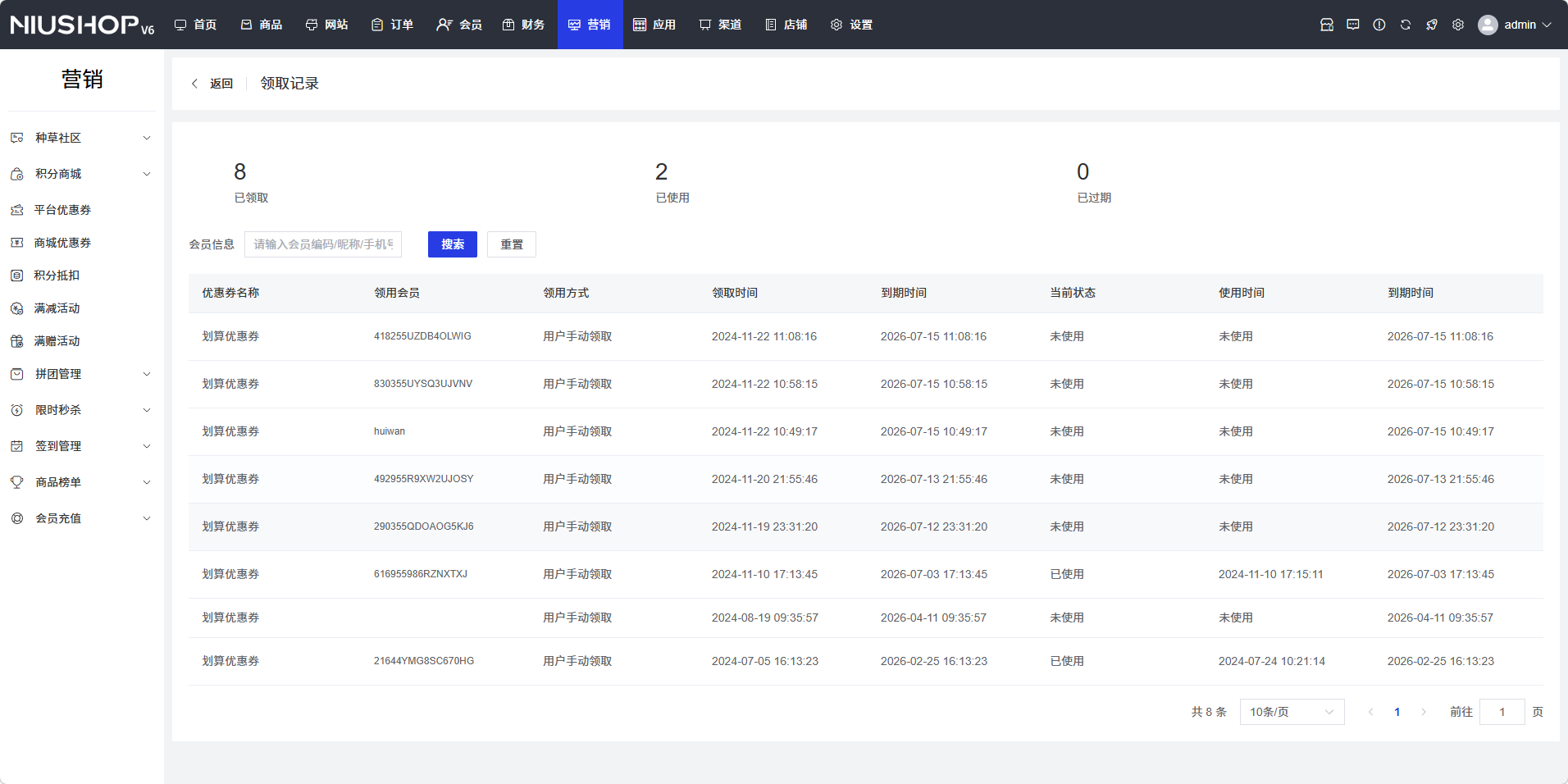 - 查看会员领取详情,包括优惠券名称、使用金额、领取方式、领取时间、到期时间、当前状态、使用时间等