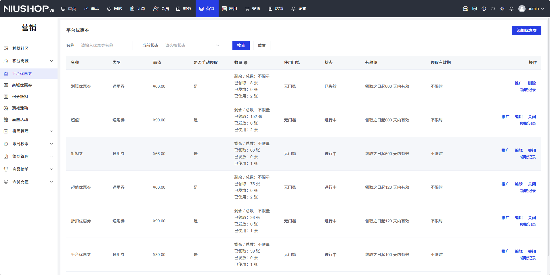 平台优惠券功能用于管理平台的优惠券,包括添加、编辑、删除优惠券,设置优惠券名称、面额、使用条件、有效期等。通过平台优惠券管理,可以吸引用户购买,提升平台的销售业绩。