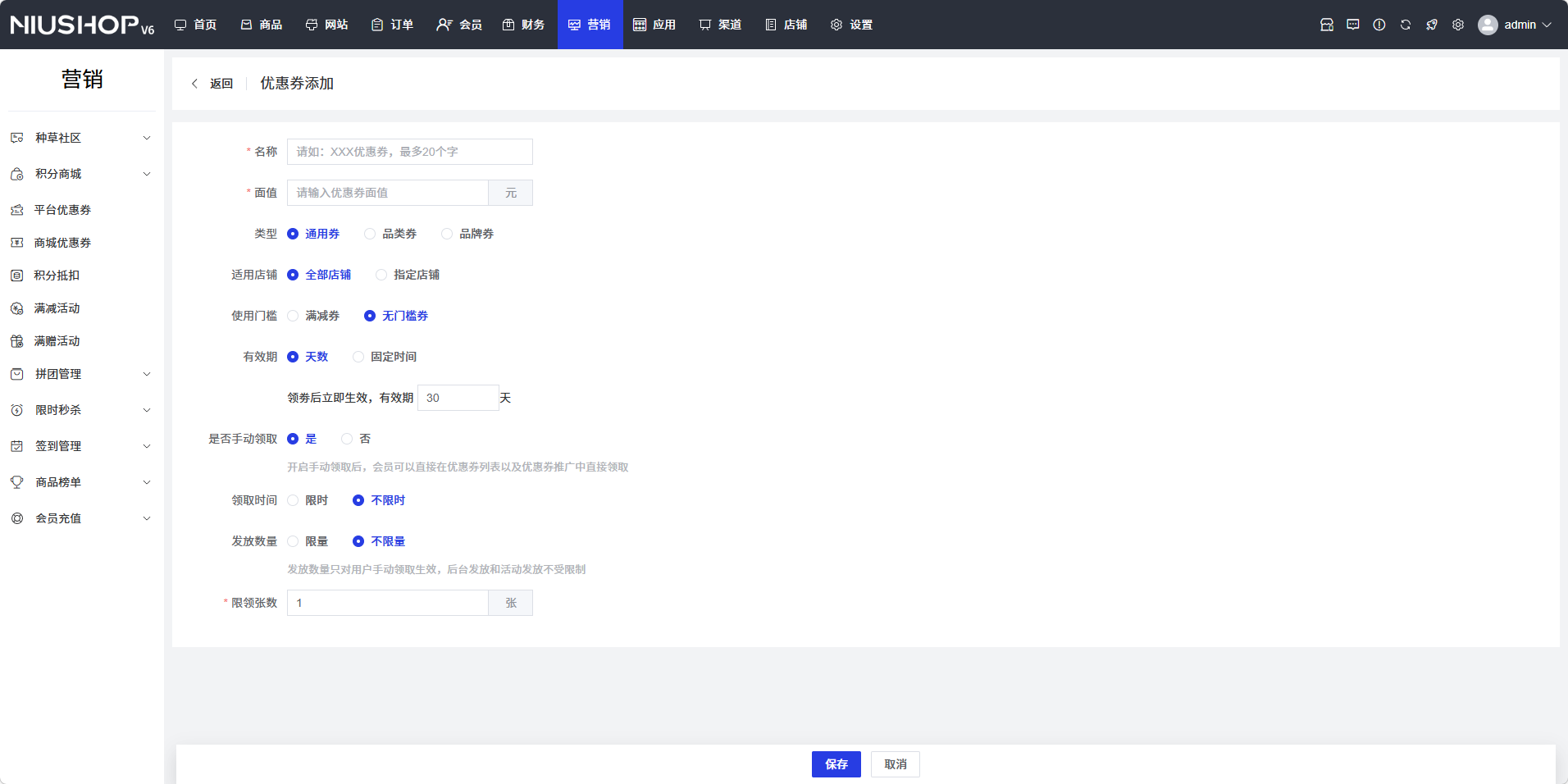 - 面额:输入优惠券面额