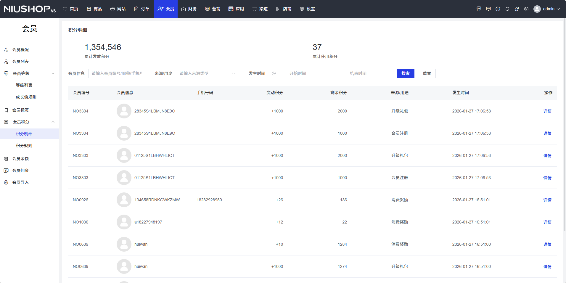 在积分明细页面,可以查看会员的积分变动记录,包括会员编号、会员信息、手机号、变动积分、剩余积分、来源用途和发生时间等。