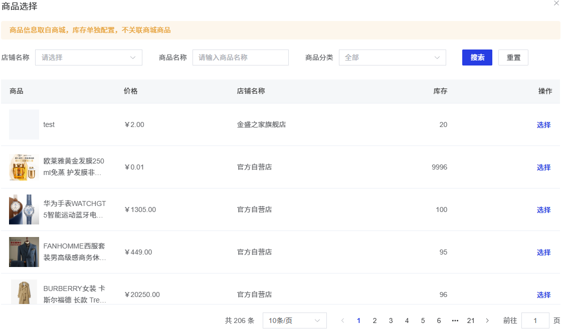 在商品列表页面顶部,通过以下筛选条件进行查询: