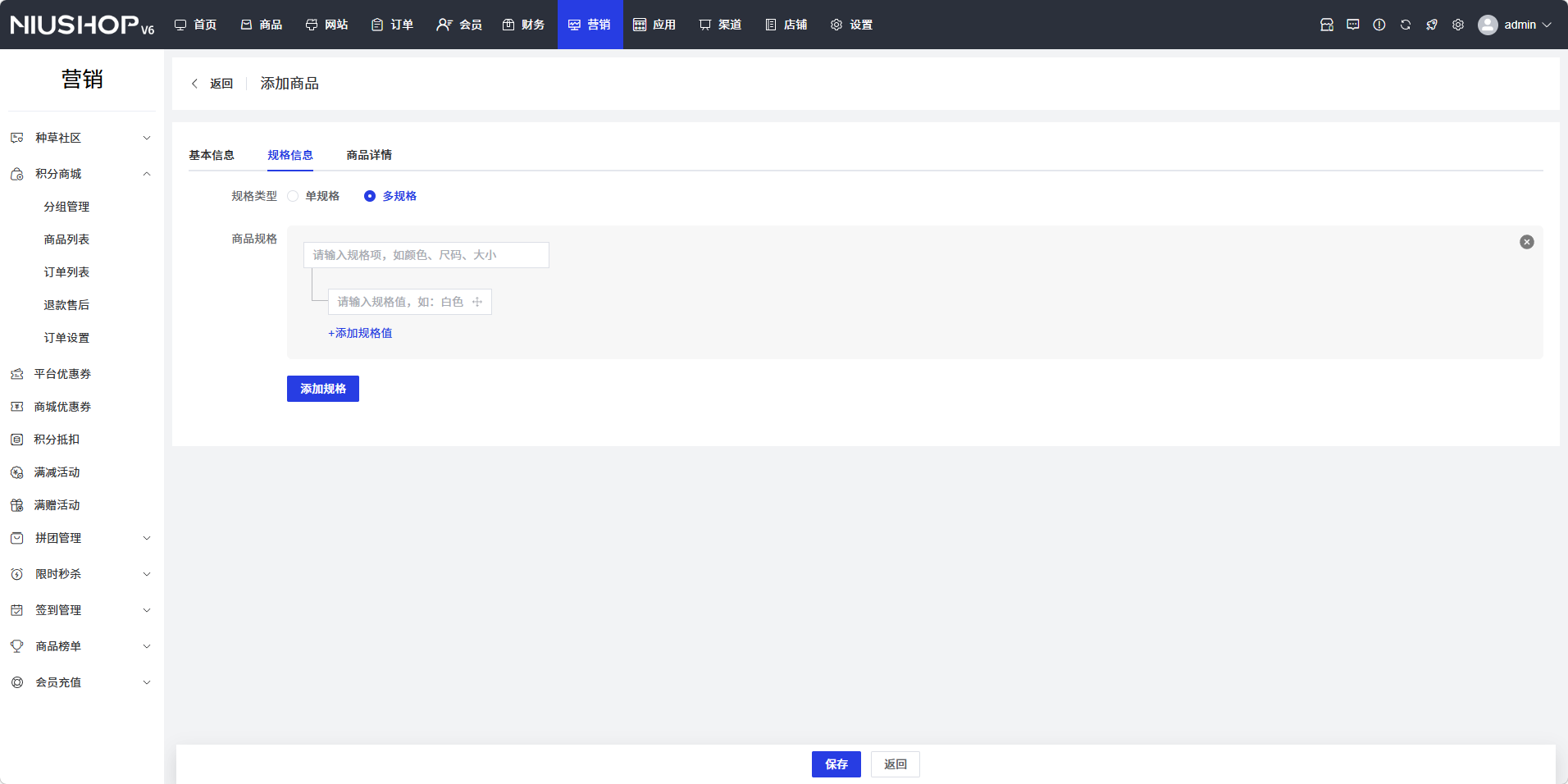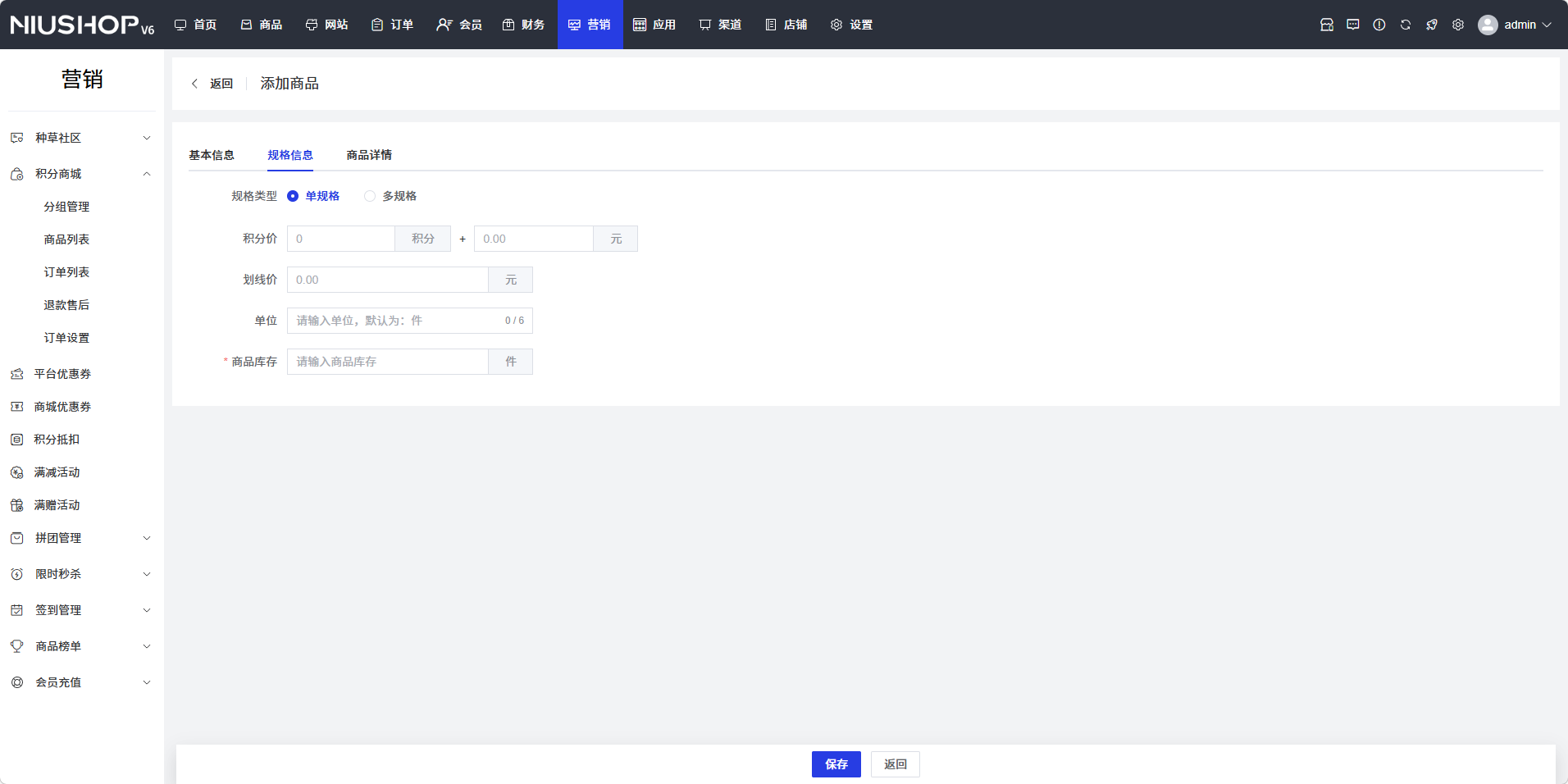 - 规格信息:选择规格类型(单规格/多规格),设置积分价格、划线价、库存等