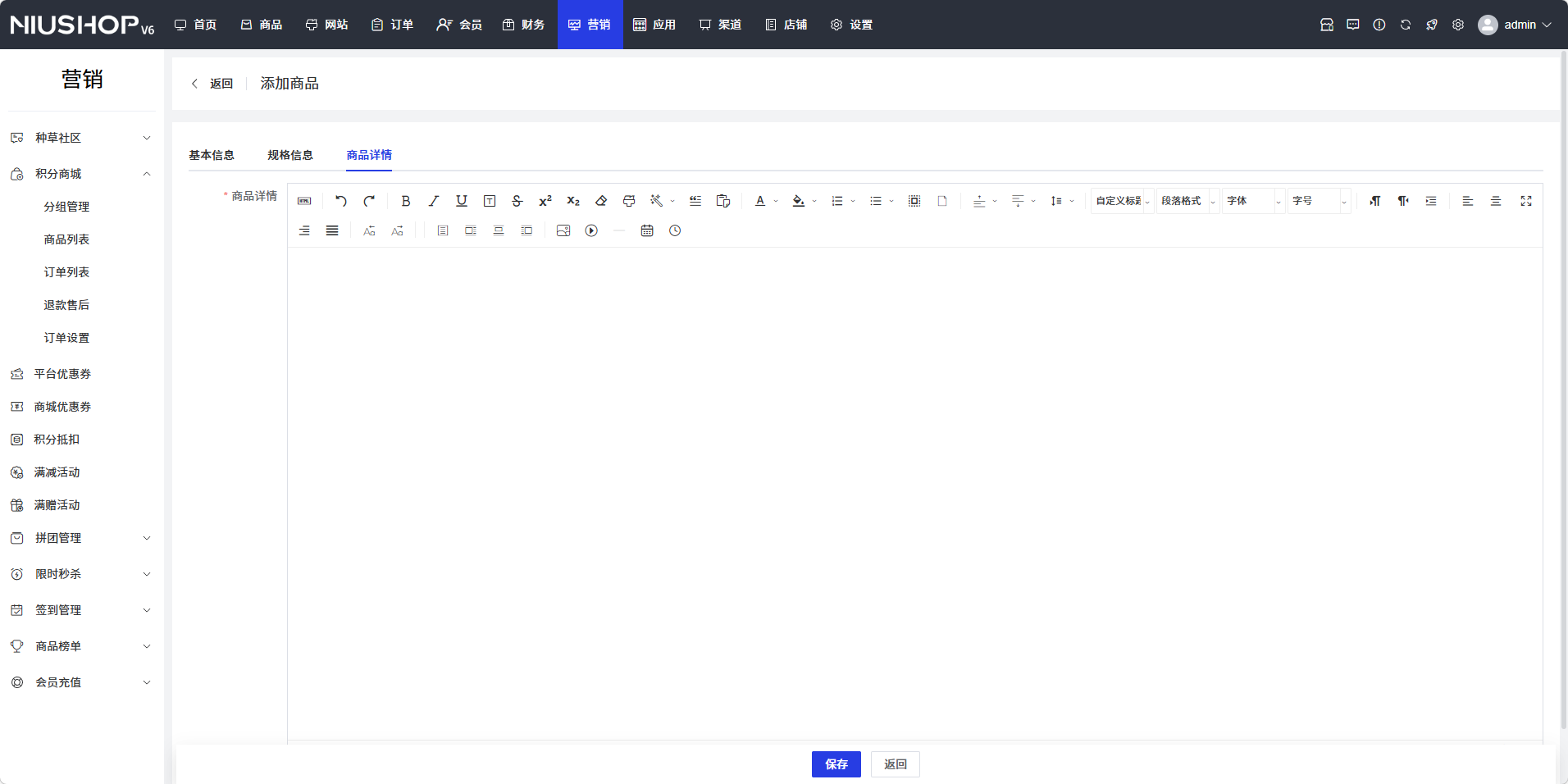 - 商品详情:在「商品详情」标签页中,使用富文本编辑器填写商品详细描述