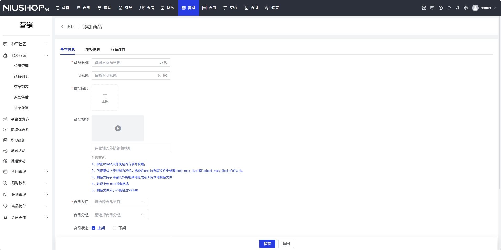 - 基本信息:输入商品名称、副标题、上传商品图片、商品视频、选择商品类目、商品分组、设置商品状态(上架/下架)、输入排序、虚拟销量、每人限购数量、适用人群、是否允许售后