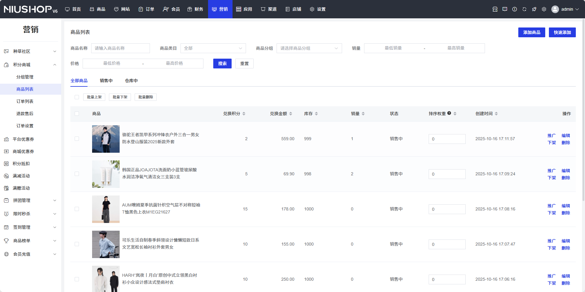 商品列表功能用于管理积分商城的商品,包括添加、编辑、删除商品,设置商品名称、图片、积分价格、库存、状态等。通过商品列表管理,可以发布和管理积分商城的商品,为用户提供积分兑换的商品选择。